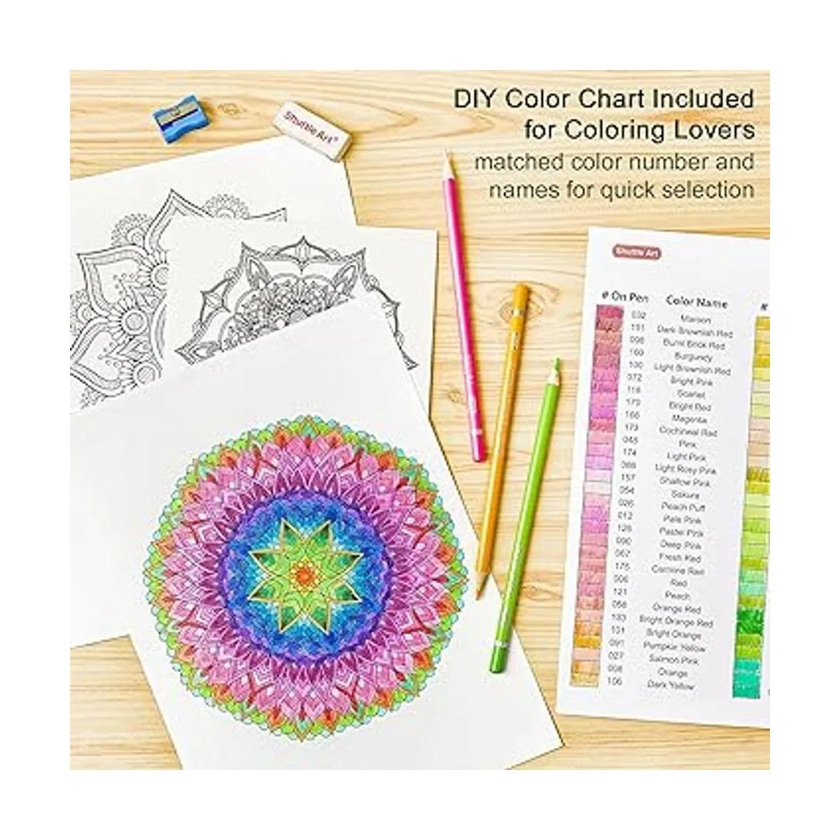 Lápices numerados con tabla de colores de bricolaje: cada lápiz está etiquetado con número y nombre de color en el barril para una fácil identificación y combinación. Junto con 1 tabla de colores y tabla de colores impresa dentro de la tapa de metal, con el número y nombre correspondientes de los lápices, lo que ayudará a hacer una rápida selección de color, especialmente para diseñadores y amantes de la coloración.