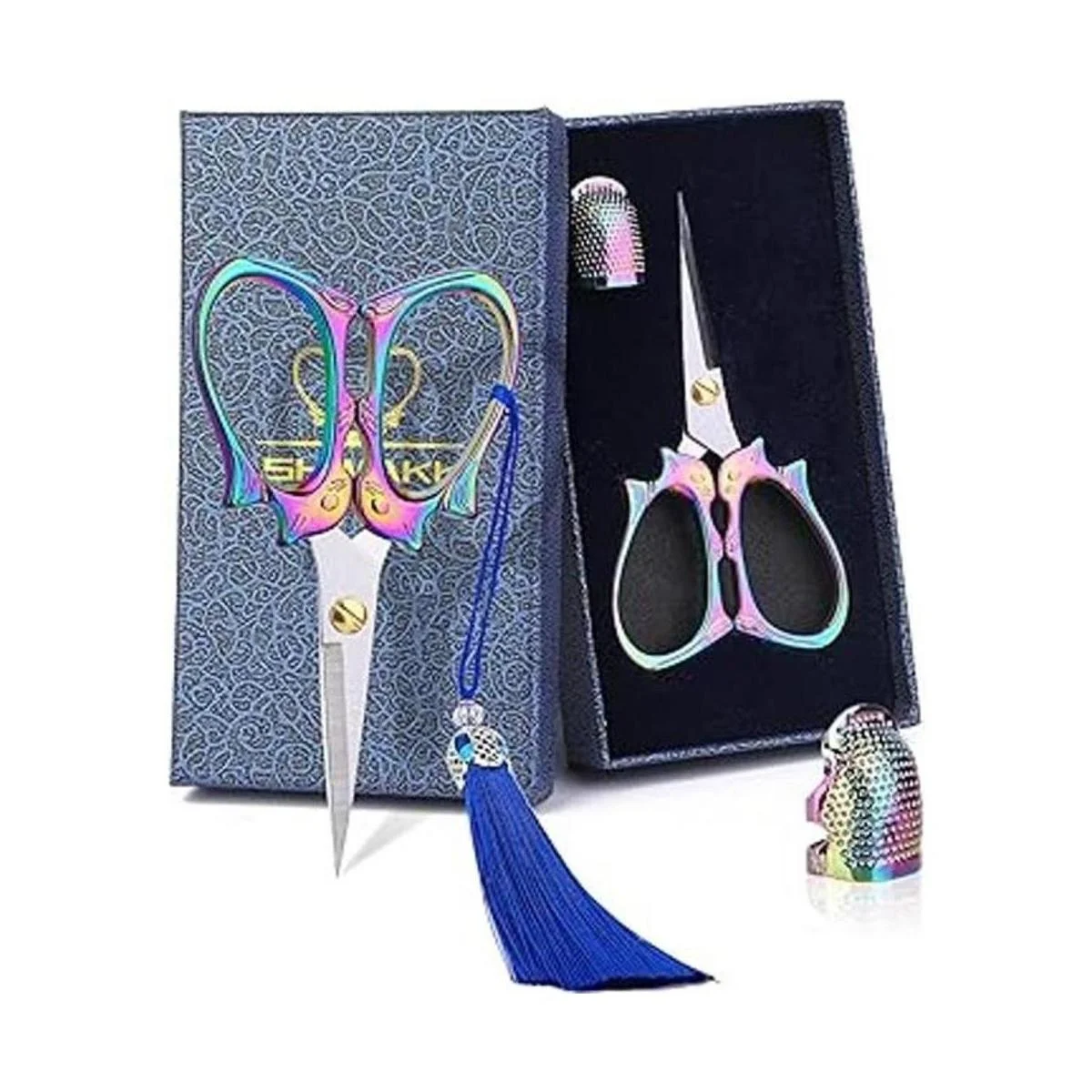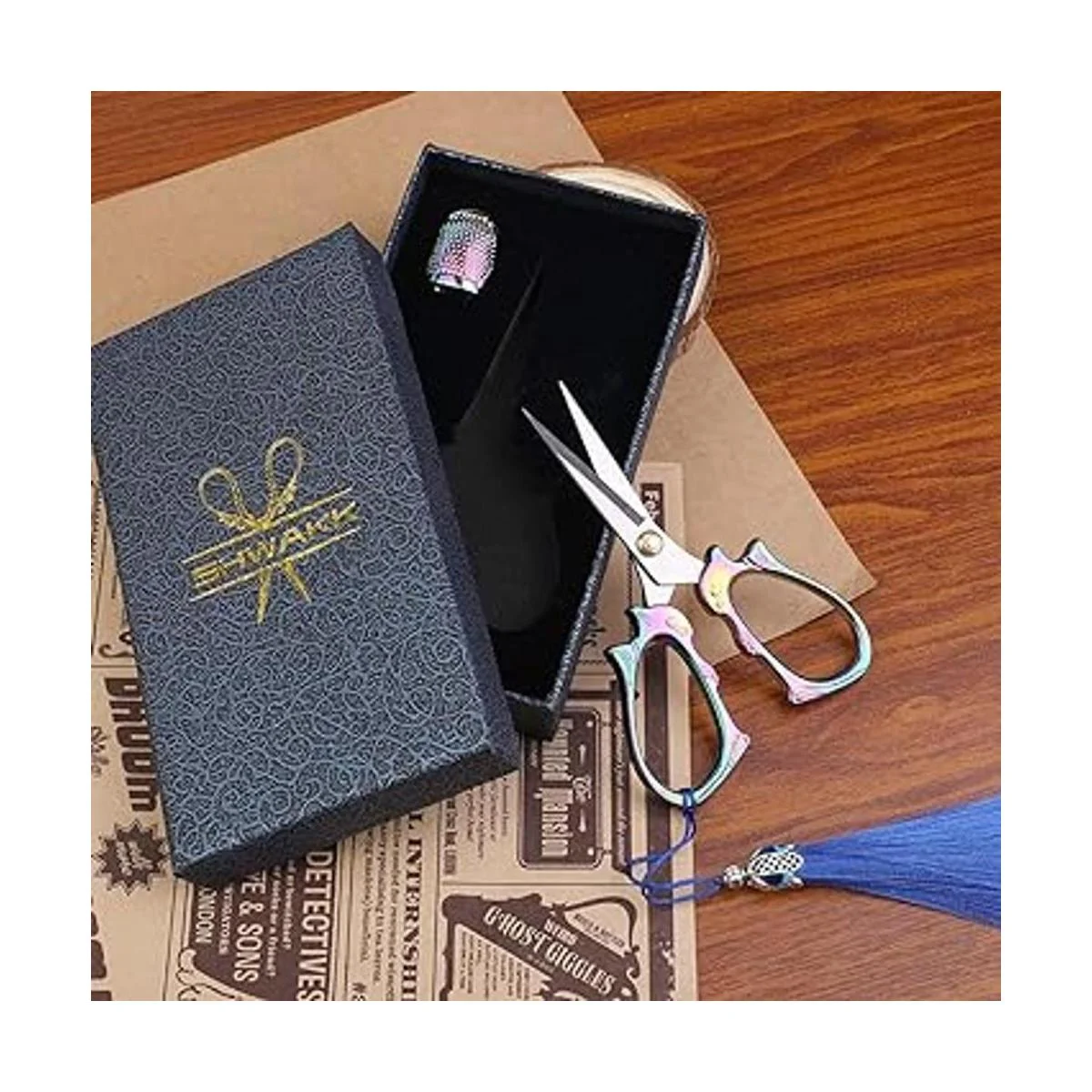 Juego de tijeras de bordado: incluye un par de tijeras en forma de ardilla con borlas y dedal del mismo color, todo en una caja, el kit de costura vintage es ligero y fácil de usar y transportar.