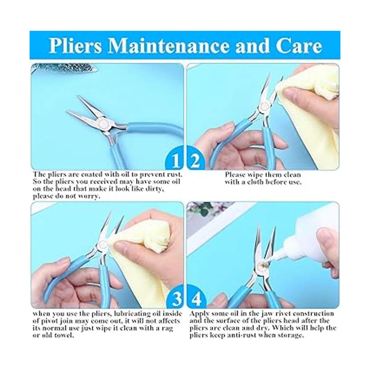 Nota: si los alicates para hacer joyas que recibiste tienen algo de aceite en la cabeza que hace que parezca sucio, no te preocupes. Las herramientas para hacer joyas están recubiertas con aceite para evitar el óxido. Limpiar con un paño antes de usar y aplicar aceite antes de guardarlos, lo que ayudará a que los alicates se mantengan antioxidantes