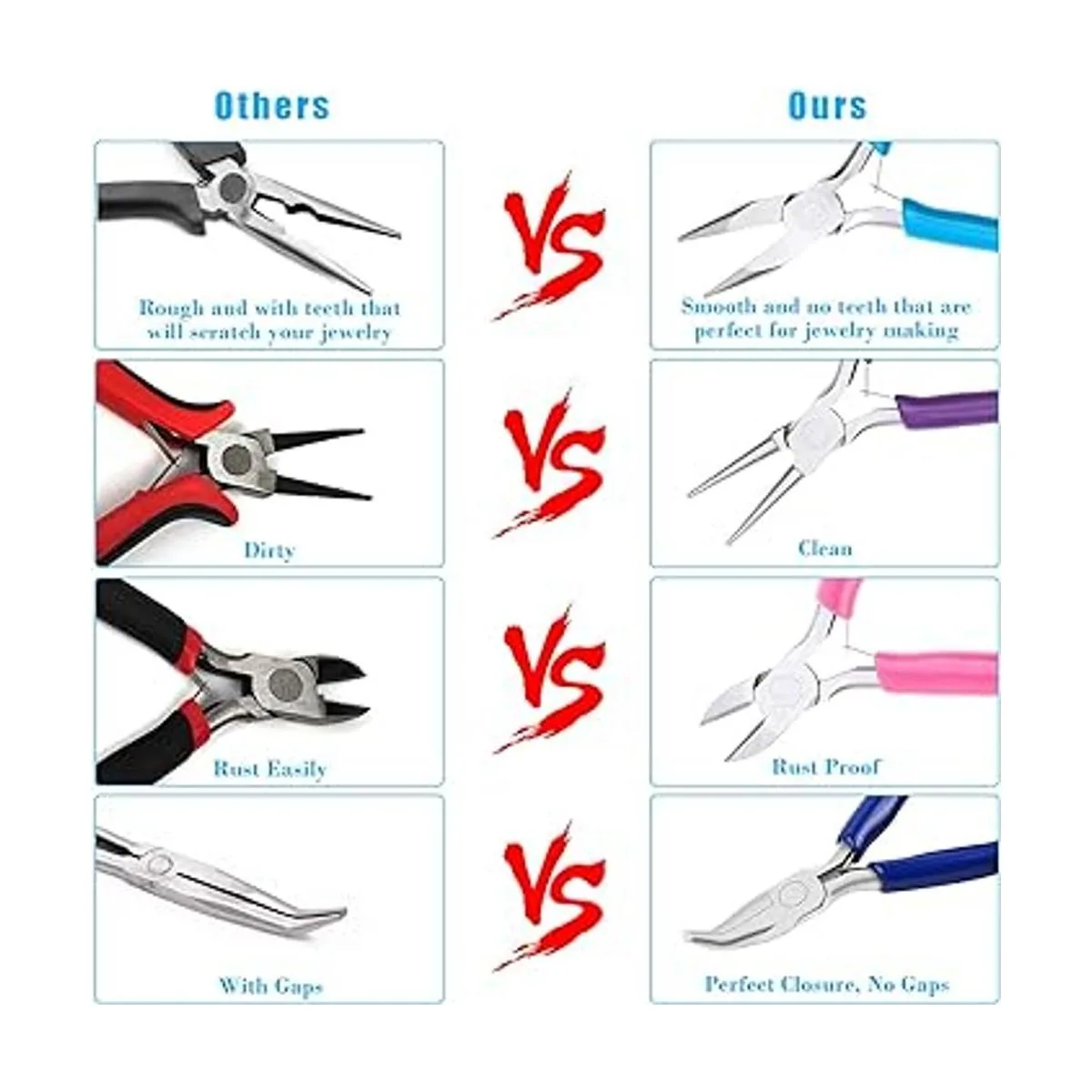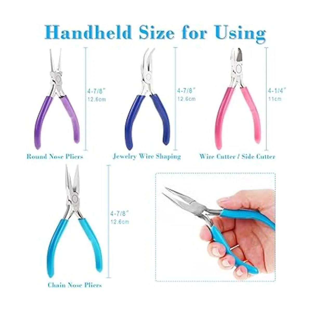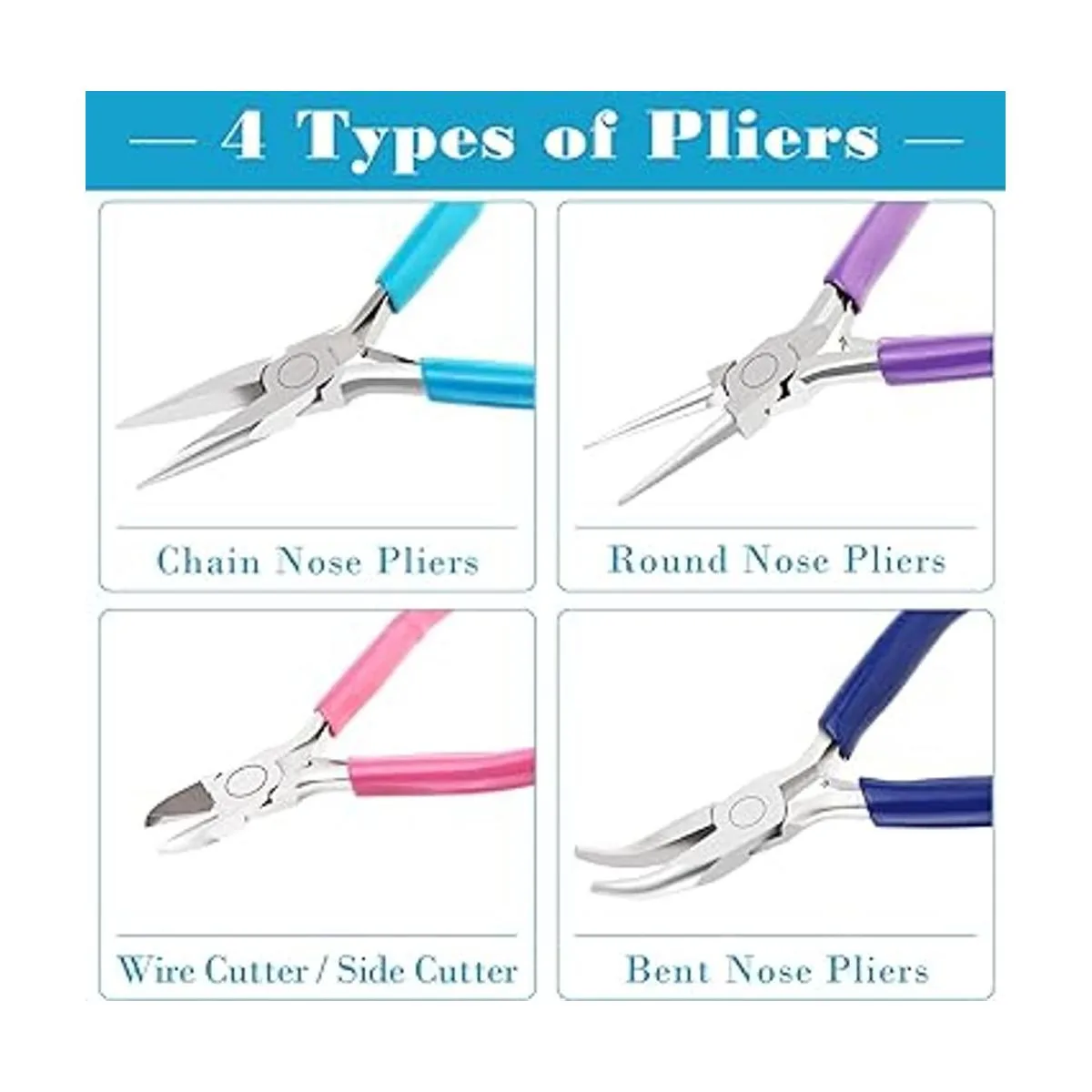 Mango de goma colorido para una fácil identificación: las herramientas de alambre para hacer joyas contienen 4 pares de alicates de joyería con asas antideslizantes, alicates de punta de cadena con mango de color azul claro, alicates de punta redonda con asas moradas, cortadores laterales con asas rosas y alicates de punta doblada con mango azul