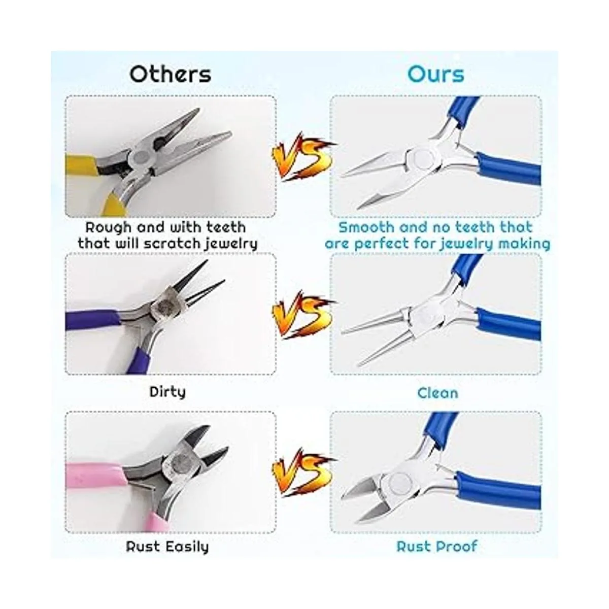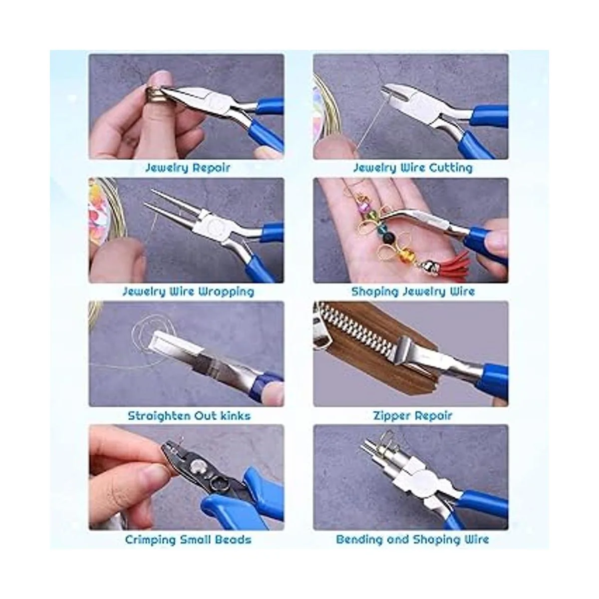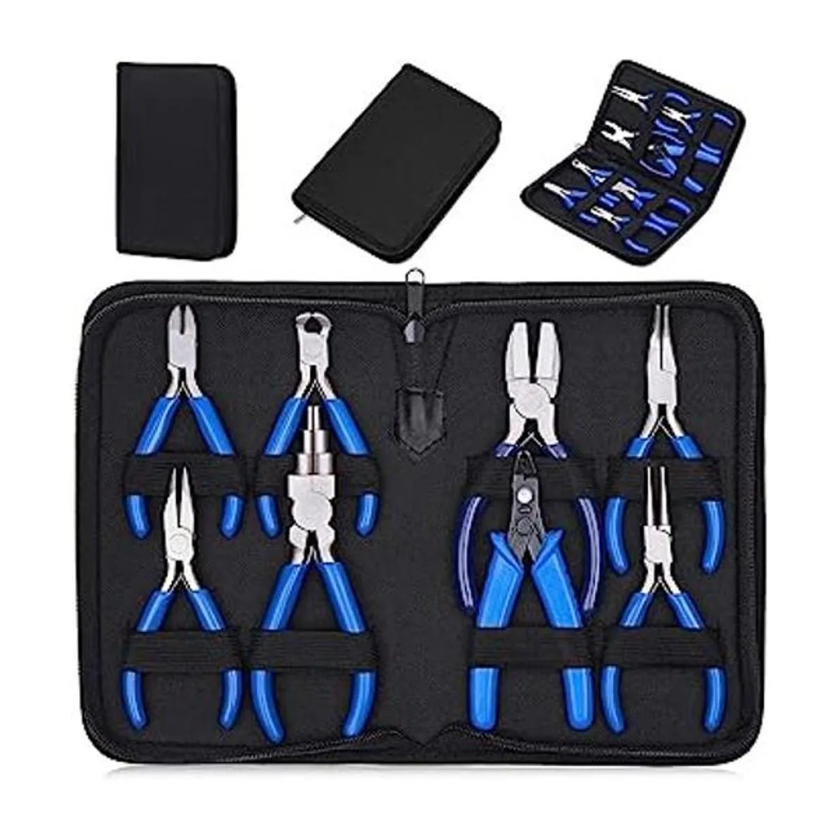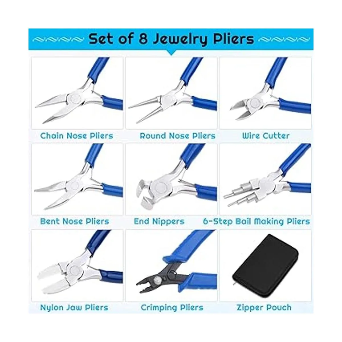 Herramientas para hacer joyas: el kit de fabricación de joyas viene con un juego de 8 alicates de joyería con bolsa de almacenamiento con cremallera. El juego de herramientas de joyería incluye alicates de punta de aguja también llamados alicates de punta de cadena, alicates de punta redonda, alicates de punta doblada, alicates de mandíbula de nailon, alicates de crimpado, pinzas finales, alicates de fianza y cortadores de alambre