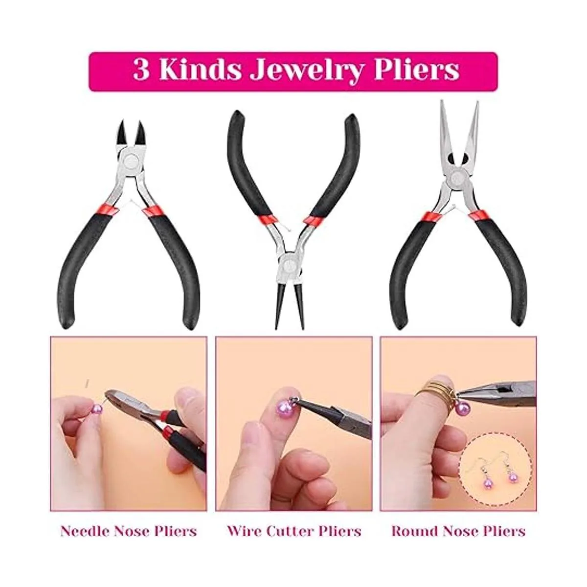 Alicates de cuentas superiores: el kit de herramientas de reparación de joyas tiene 3 alicates de joyería necesarios: alicates de punta redonda, alicates de corte de alambre y alicates de punta de cadena. Cada alicates tiene resorte de doble hoja y asas antideslizantes que los hacen eficaces y seguros de su uso