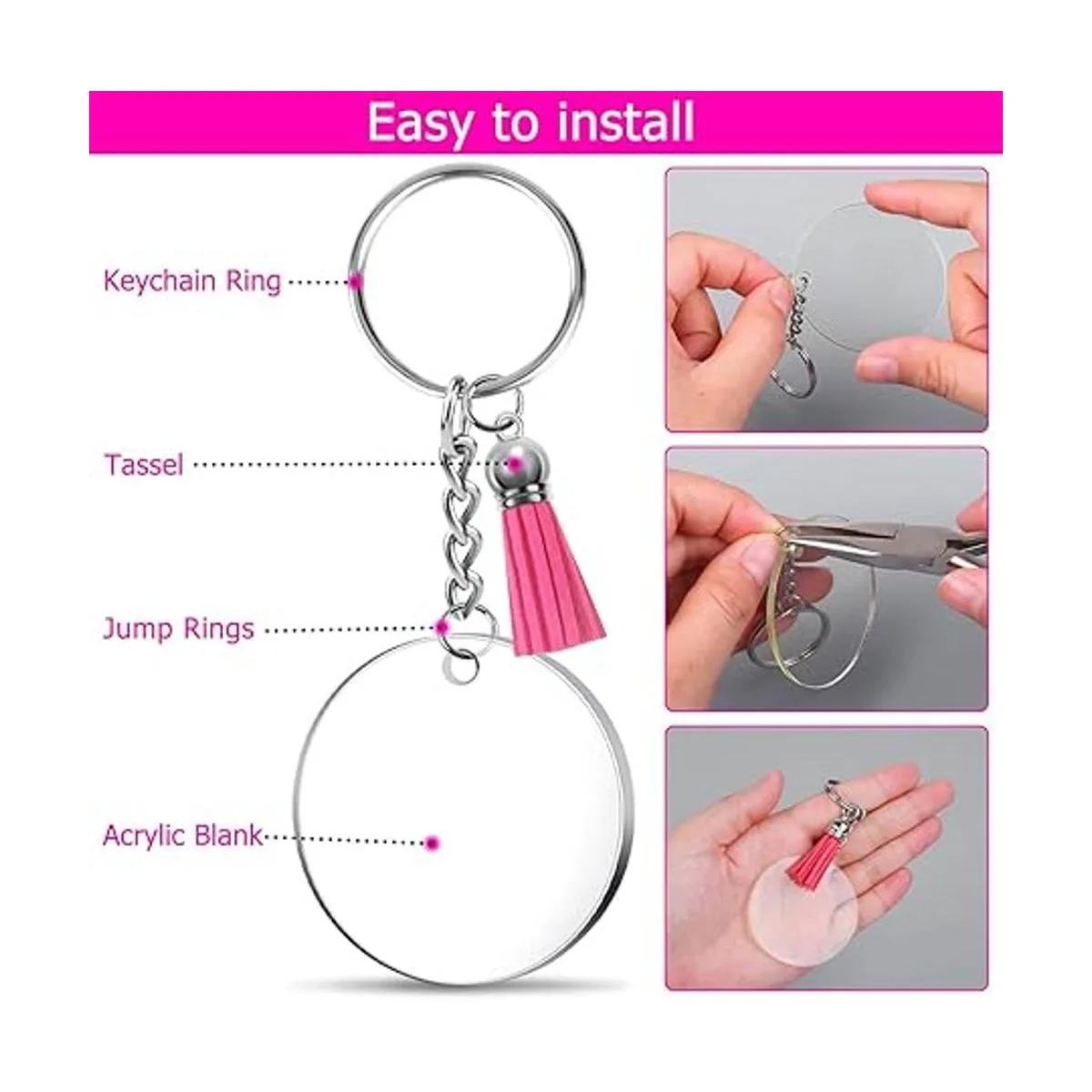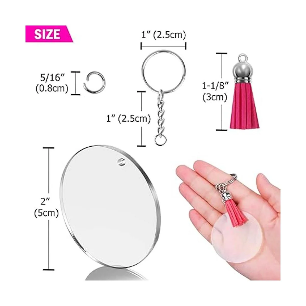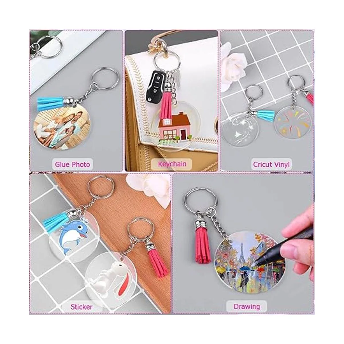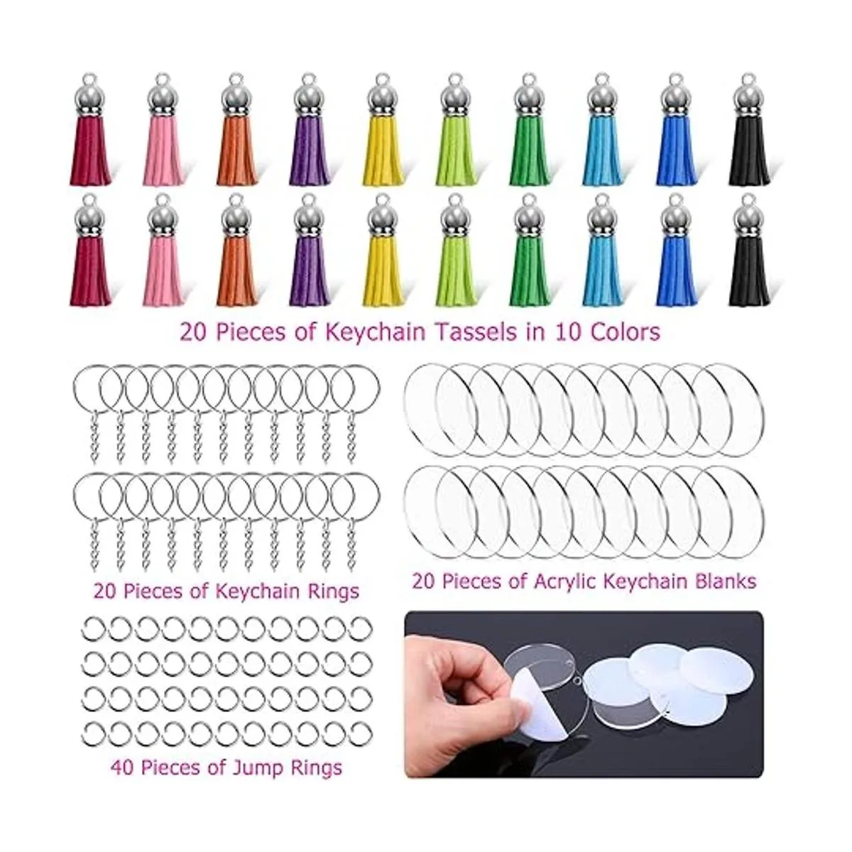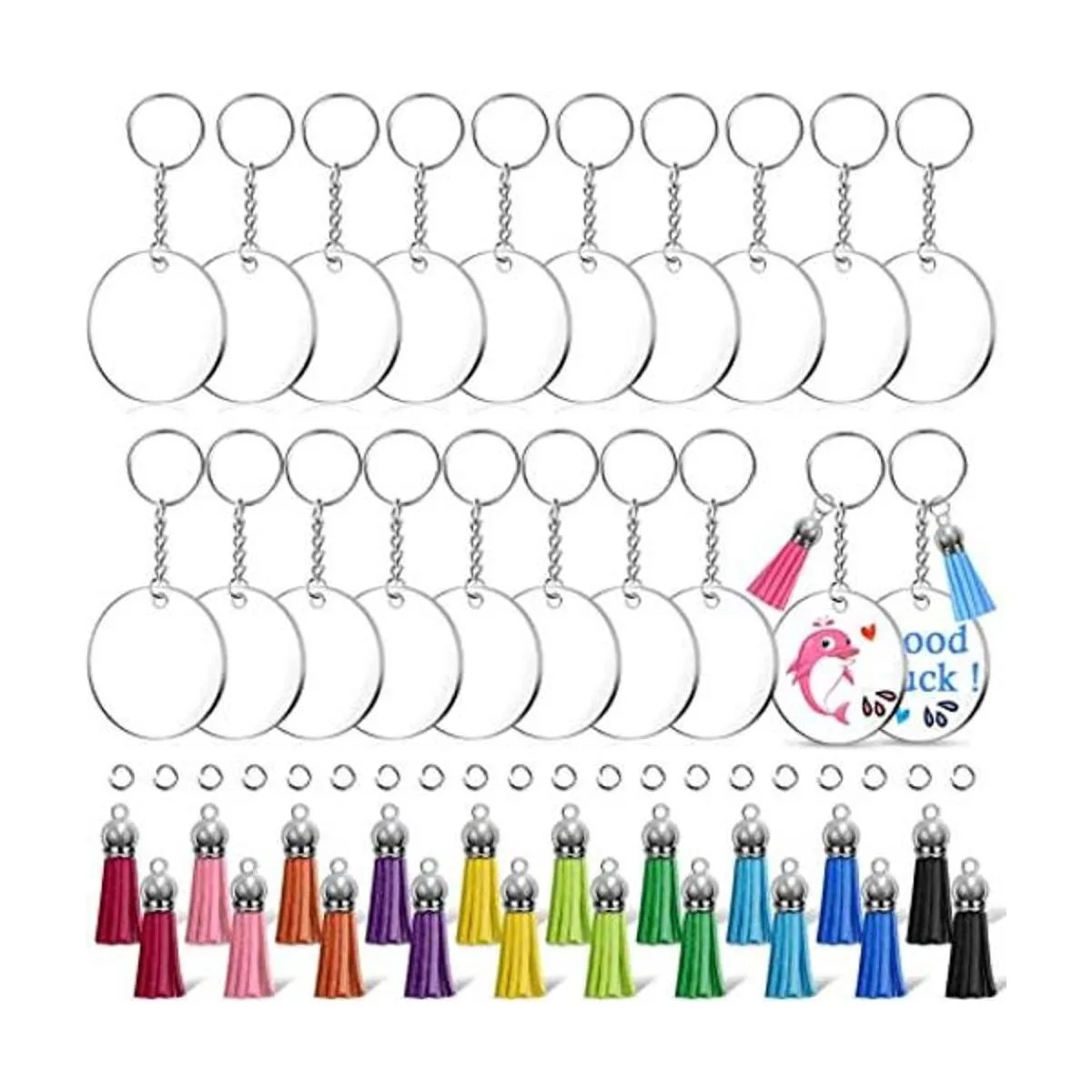 Shynek Llavero de acrílico, 100 piezas, suministros de accesorios para llavero para juego de manualidades con espacios en blanco acrílico, llaveros, borlas y anillos de salto para proyectos de vinilo, suministros de llaveros de bricolaje