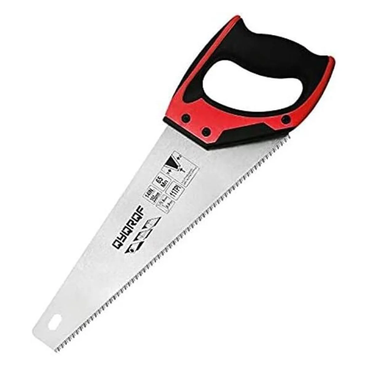 Sierra de mano Pro de 14 pulgadas, sierra de mano de punta dura de 11 TPI de corte fino perfecta para sierrar, recortar, jardinería, cortar madera, paneles de yeso, tubos de plástico, hoja afilada, mango ergonómico antideslizante rojo