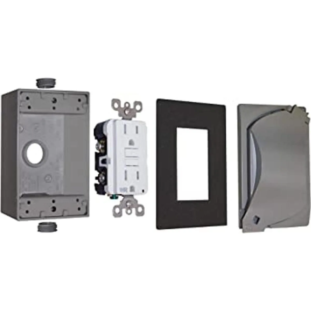 El kit completo incluye cubierta universal, caja de una banda con tres agujeros de 0.5 in, receptáculo GFCI, tapones de cierre, hardware y junta