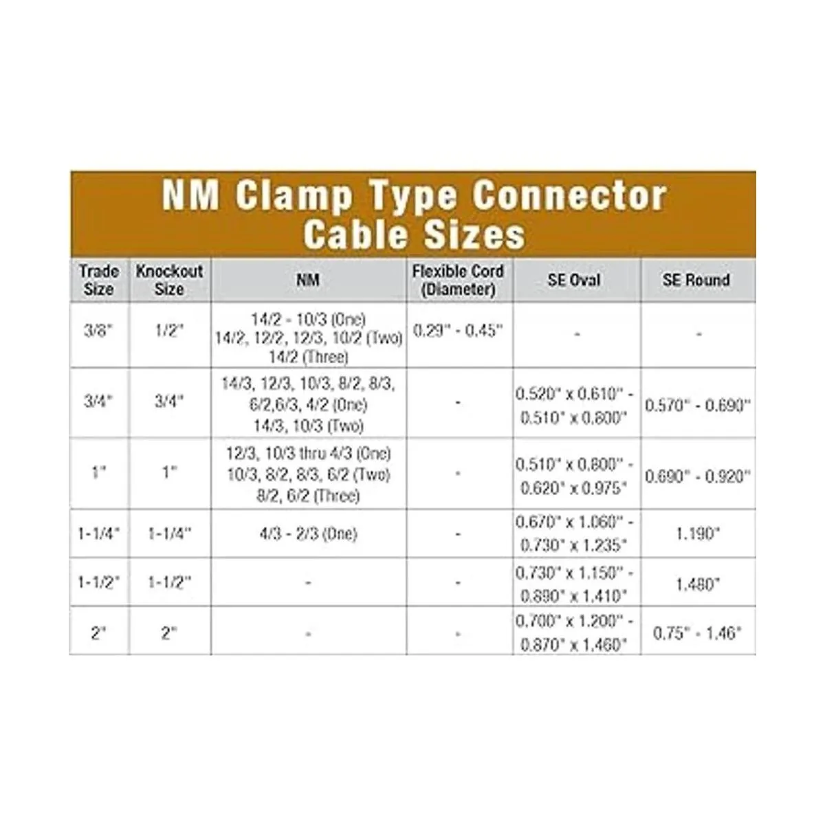 Para un cable de 10/3 4/2 NM, 0.5 x 0.6 x 0.5 x 0.8 pulgadas ovalado SE o 0.5 0.7 pulgadas redondo SE
