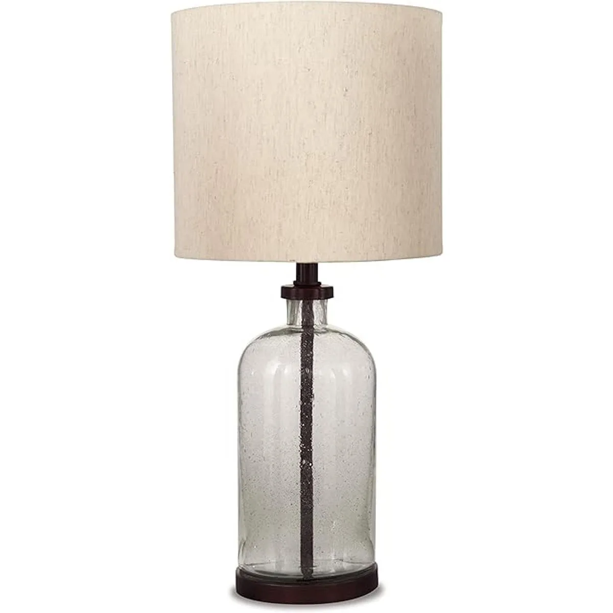 Diseño de calidad: hecha de vidrio semillado y metal con un acabado en tono bronce, esta lámpara está rematada con una simple pantalla de tambor con tela beige para un interés texturizado; con interruptor de encendido/apagado