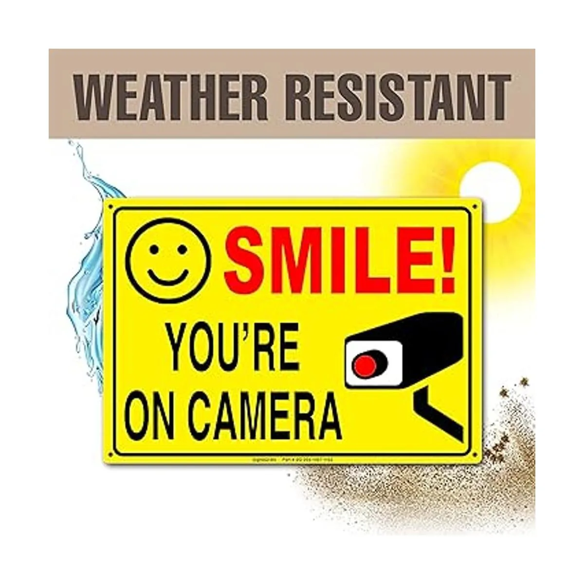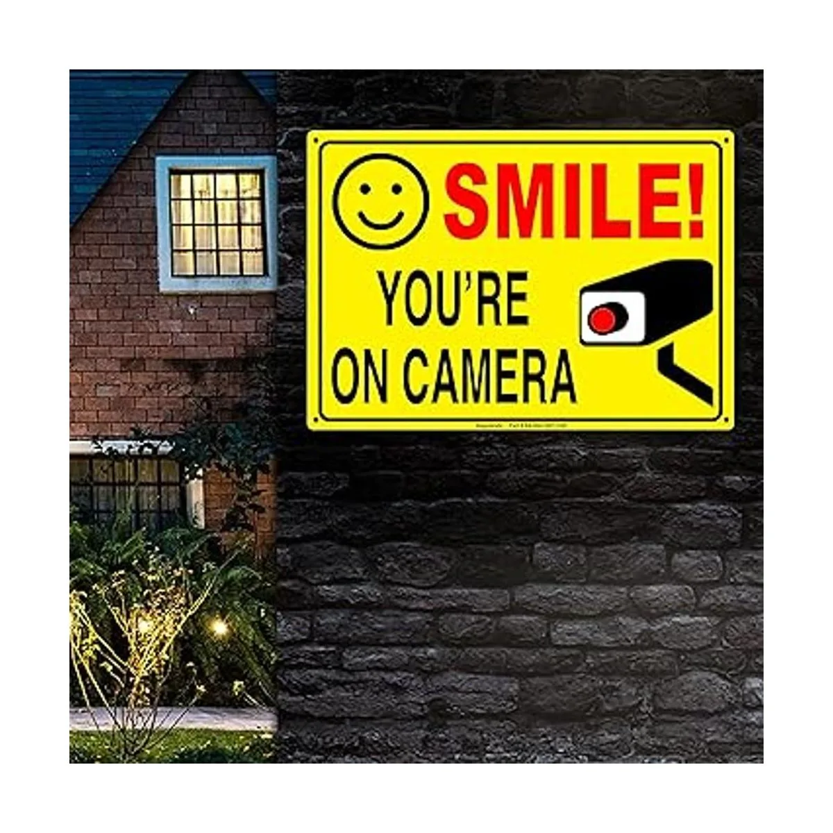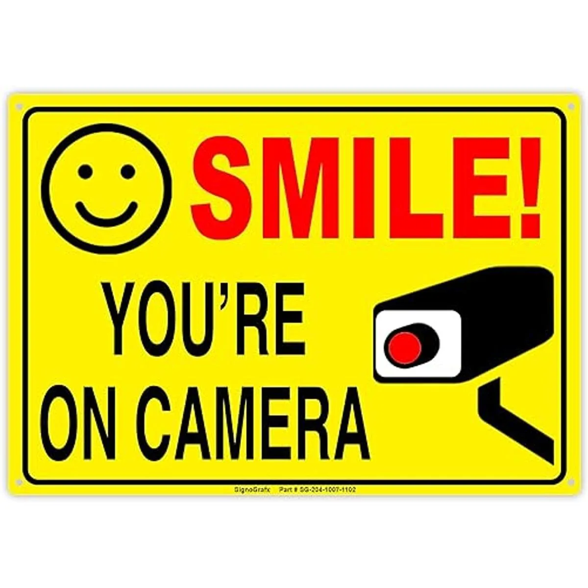 Legible: letrero de sonríe que estás en la cámara. Texto muy claro y nítido hecho con impresión de alta calidad y la letra es clara para leer,