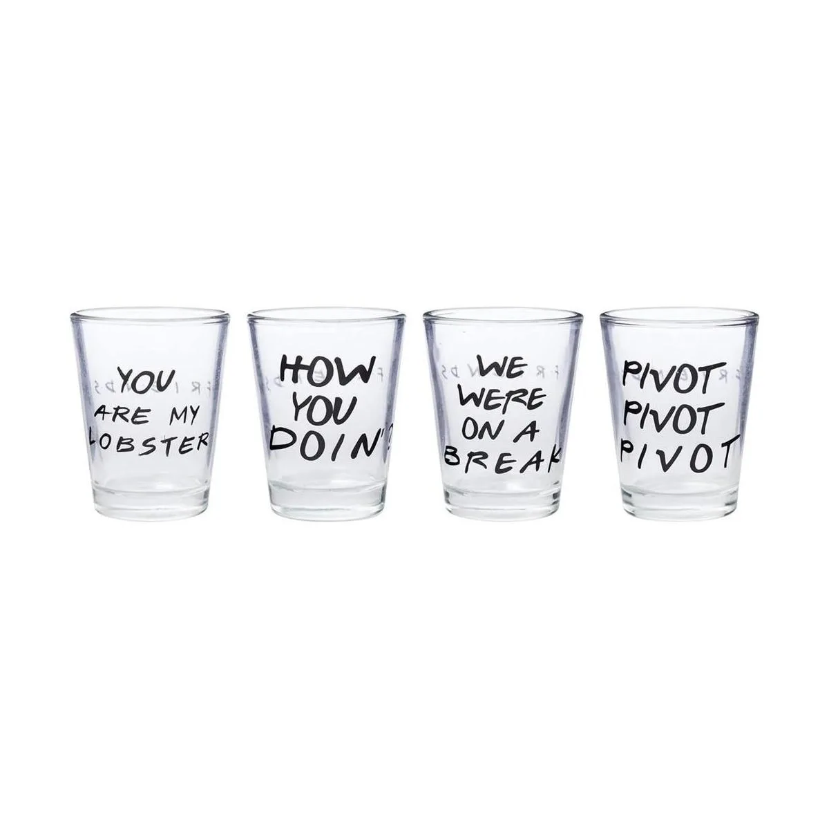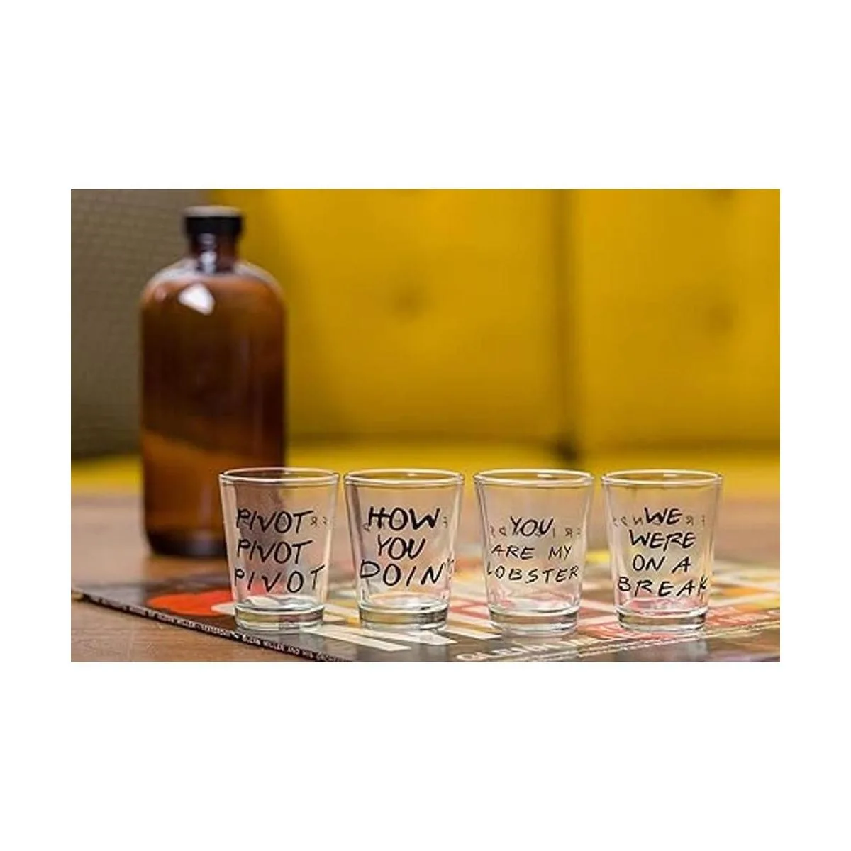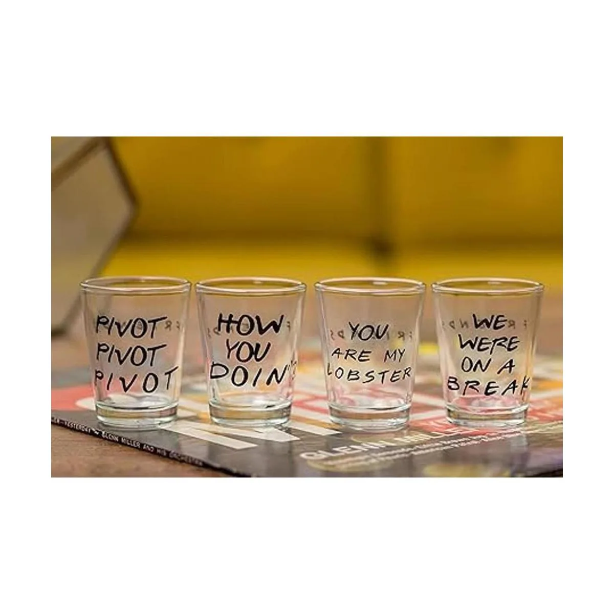 Mini juego de cristal: este paquete de 4 mini gafas cuenta con algunas de las citas más memorables del exitoso programa de televisión Friends para que reproduzcas tus escenas favoritas con tus amigos
