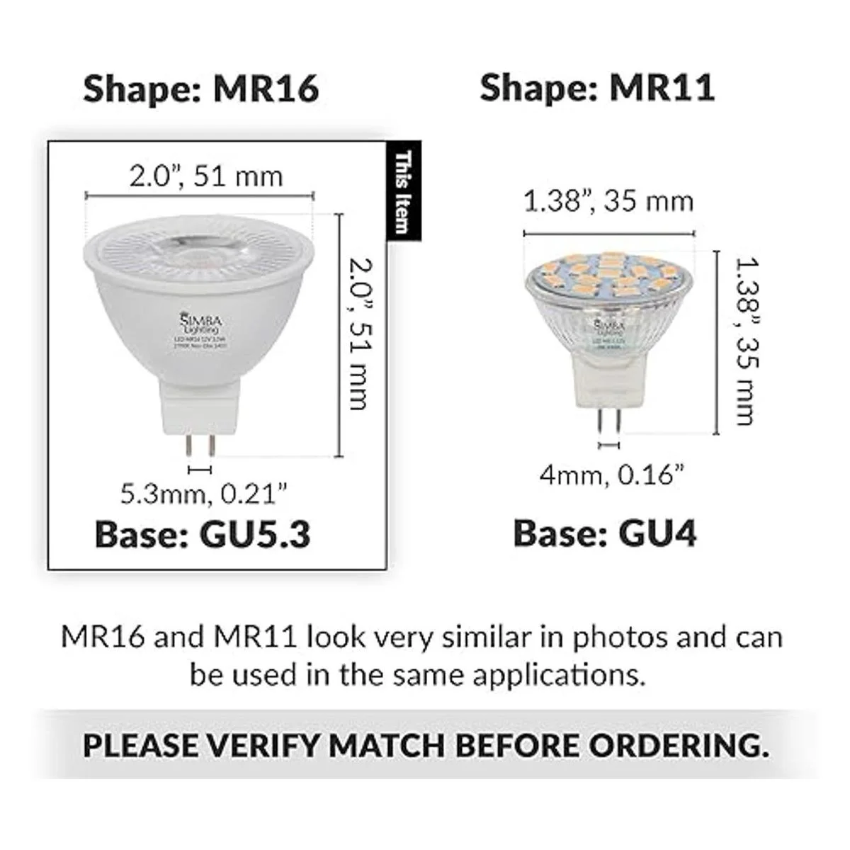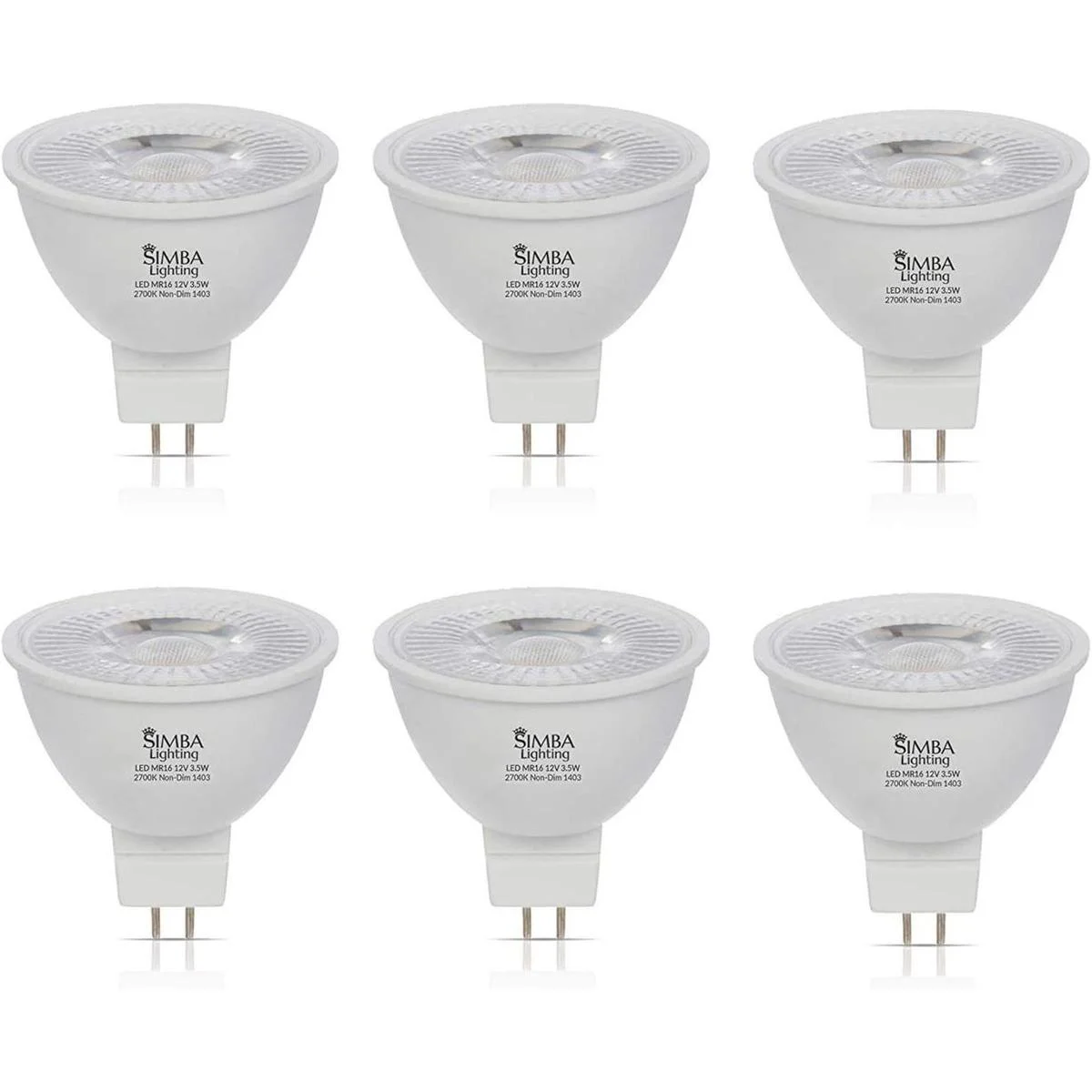 Simba Lighting Bombilla LED MR16 de 3.5 W y 12 V paquete de 6 foco halógeno de 20 W de repuesto para paisajes, acentos, luces de pista, lámparas de escritorio, BAB C, base bipina GU5.3, blanco cálido de 2700 K, no regulable