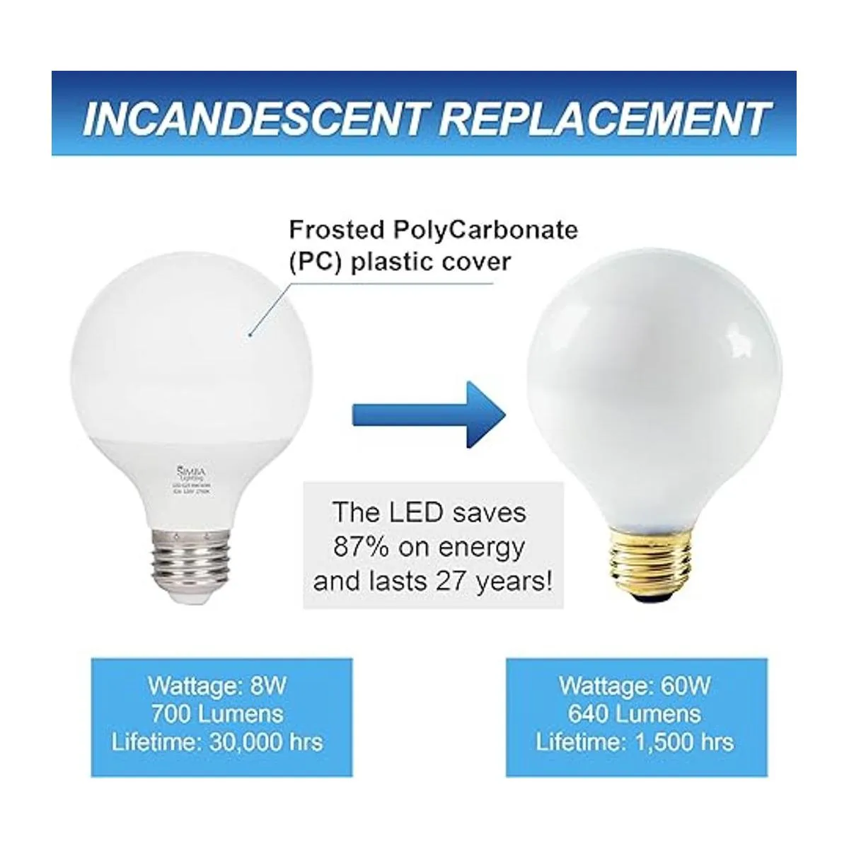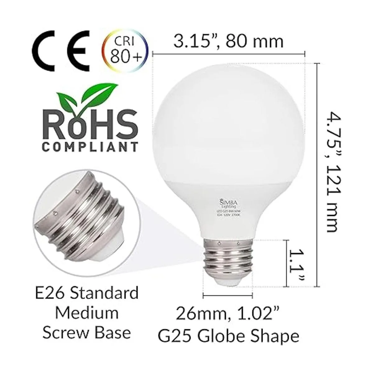 Duradero y tamaño estándar: aluminio con cubierta de policarbonato esmerilado PC. Diámetro: 3.150 in, longitud: 4.764 in, forma: globo grande G25 G80 en Europa, base: E26 estándar mediano 1.024 in de diámetro. Paquete de 3 unidades.