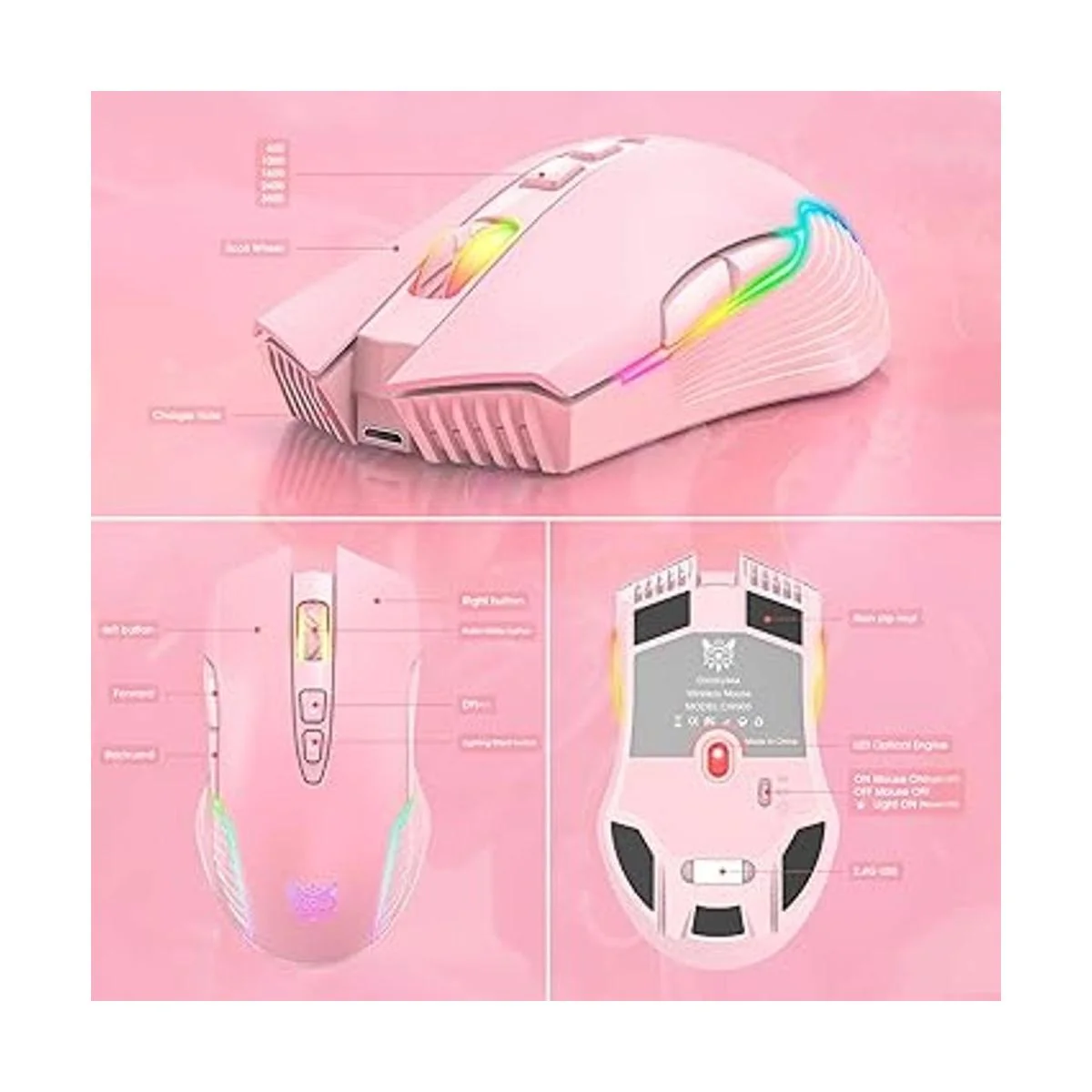 SIMGAL Mouse inalámbrico RGB para juegos, ratones recargables para computadora con 5 DPI ajustables de hasta 3600, mouse ergonómico para computadora portátil con 7 botones no programables compatible con Windows Vista Linux rosa