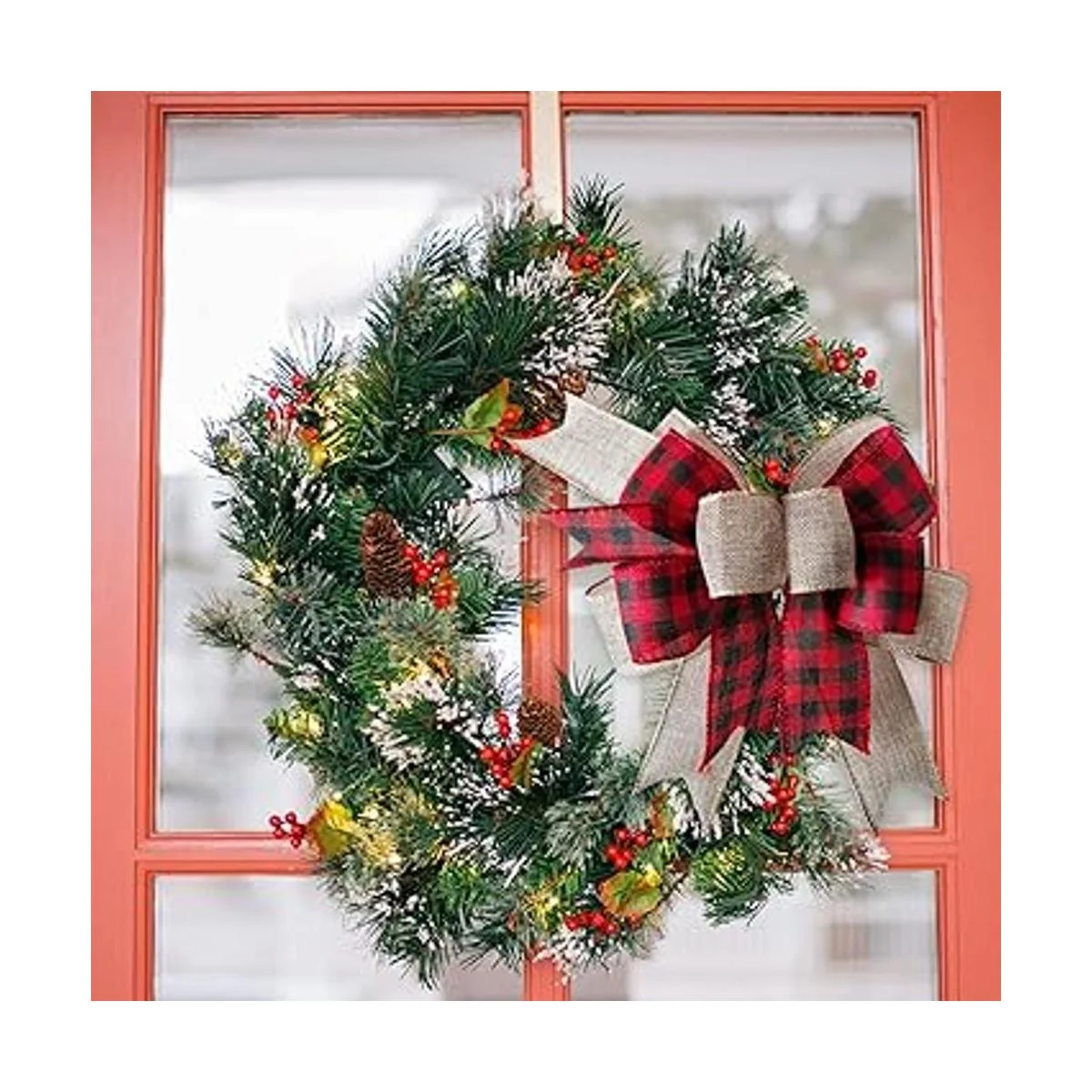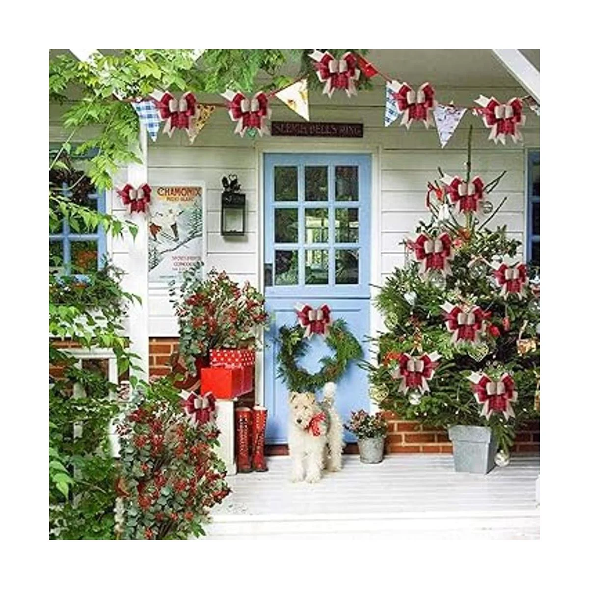 Material: nuestros lazos de corona de Navidad están hechos de arpillera de poliéster, que cuenta con una resistencia duradera, resistente y no se decolora fácilmente, el color y los patrones se mantendrán brillantes, y el lazo sin dañarse cuando se decora al aire libre.