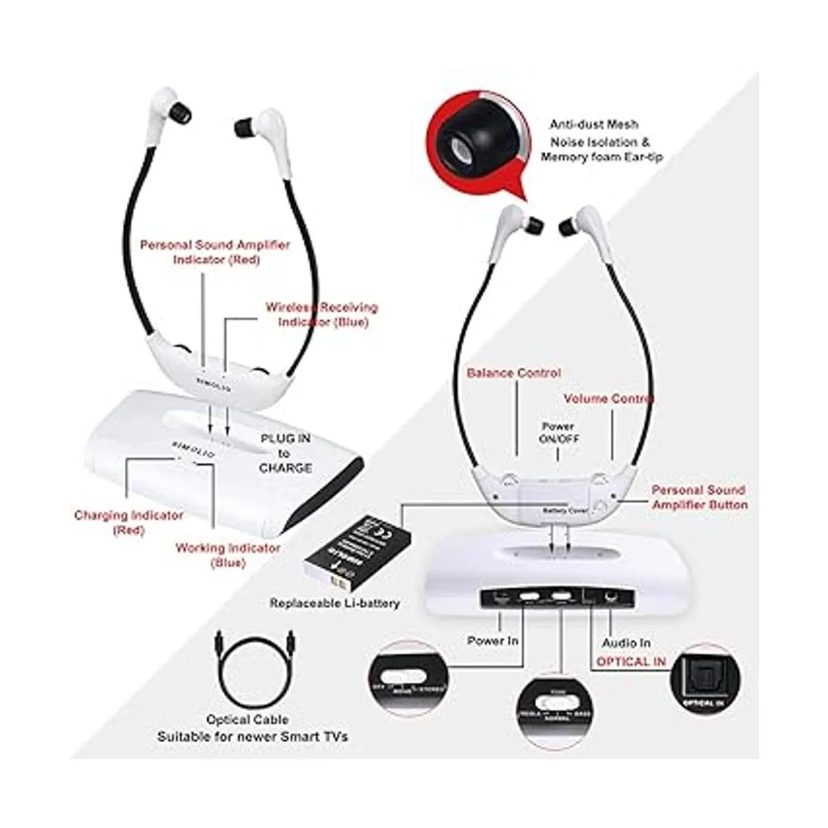 SIMOLIO Auriculares inalámbricos de TV de larga distancia de 100 pies para TV digital y analógica, dispositivo de escucha de TV para personas con discapacidad auditiva y personas mayores, con resaltado de voz, control de tono y ajuste de equilibrio SM823D Pro