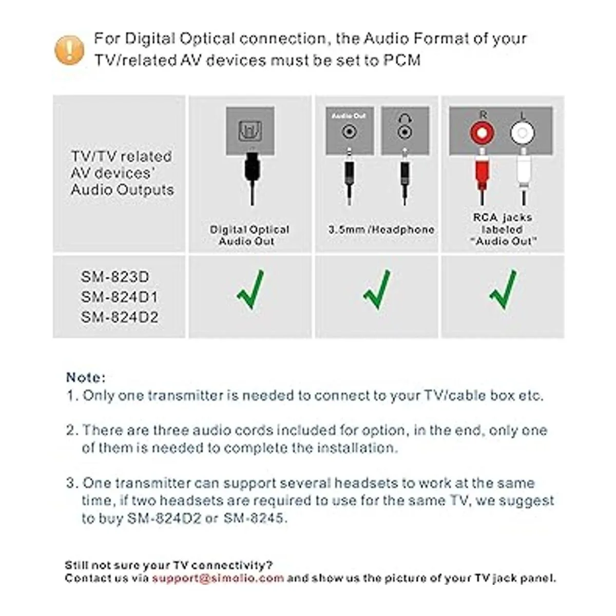 Protección auditiva y auriculares inalámbricos de asistencia para TV: la tecnología de resaltado de voz y reducción de ruido reduce los sonidos de fondo de TV y hace que los diálogos de TV destaquen. La tecnología de control de señal automática ajusta el volumen de aumento repentino para hacer que la salida de audio sea estable, lo que evita que tu audición se dañe por un aumento repentino en el volumen de la televisión. Compatible con conexiones ópticas, RCA y salida de audio de 0.138 in. Si la salida óptica del televisor está ocupada por la barra de sonido, necesitas un divisor óptico para la instalación.