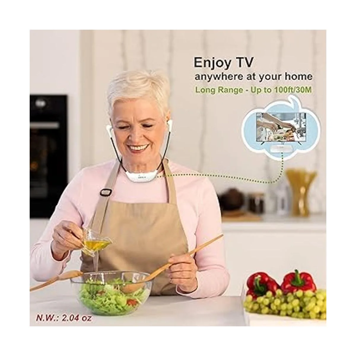 Batería de litio recargable y reemplazable, función de amplificador de sonido personal: una carga completa soporta 57 horas de funcionamiento continuo dependiendo de las condiciones de trabajo, como el ajuste de volumen. El modo amplificador de sonido personal te permite escuchar lo que la gente te está hablando cerca sin quitar los auriculares inalámbricos de TV.
