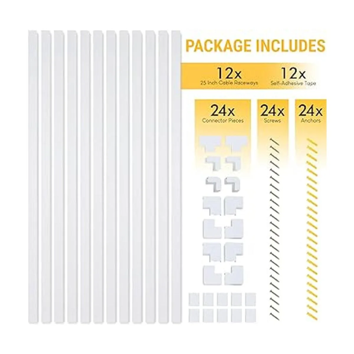 Corrector de cable blanco. El equivalente de dos correctores de cable completo de SimpleCord. Cada paquete contiene 12 canaletas de cubierta de cable de 1.1 x 1.1 x 25.0 in cada una. Es de 300.8 in de cubiertas para cables.