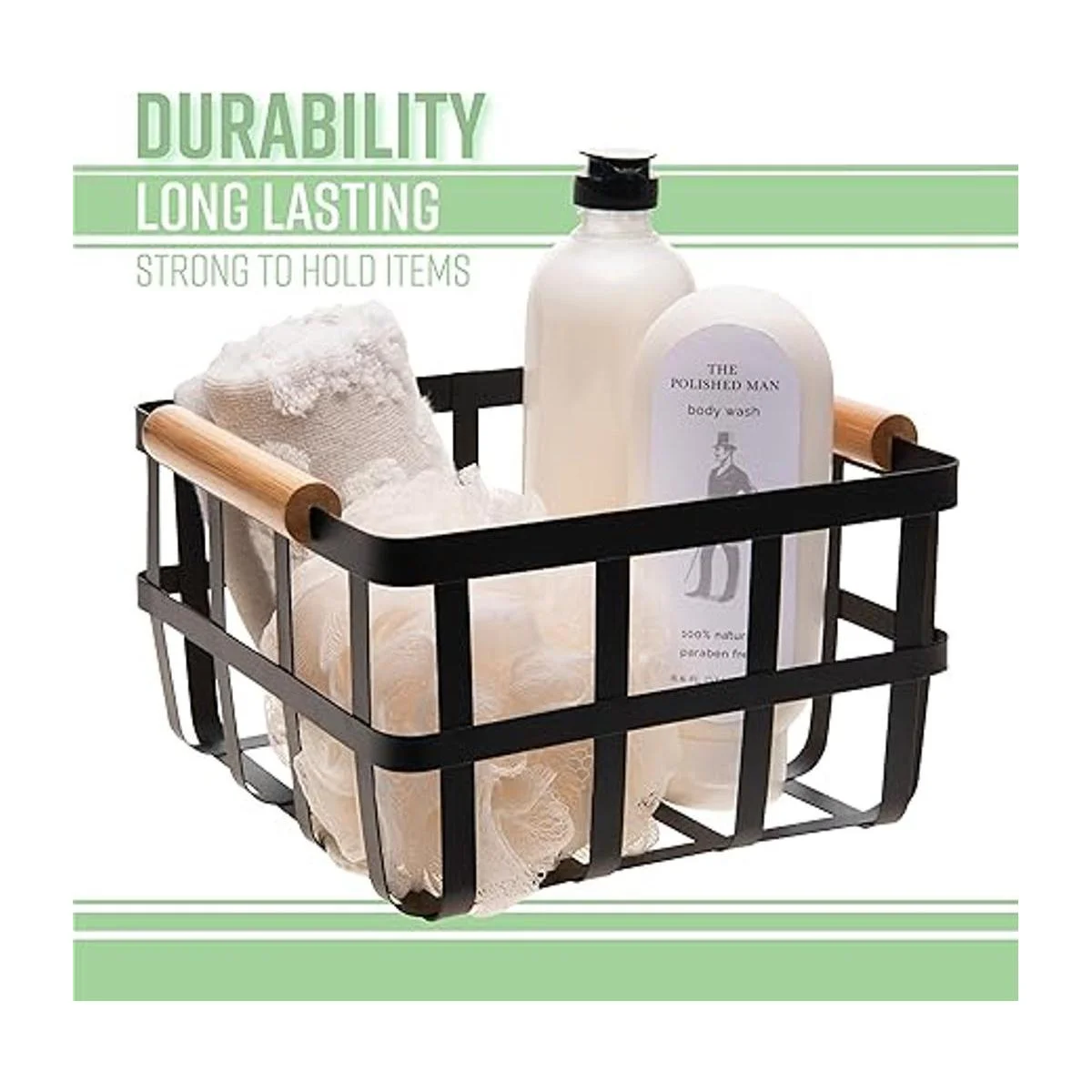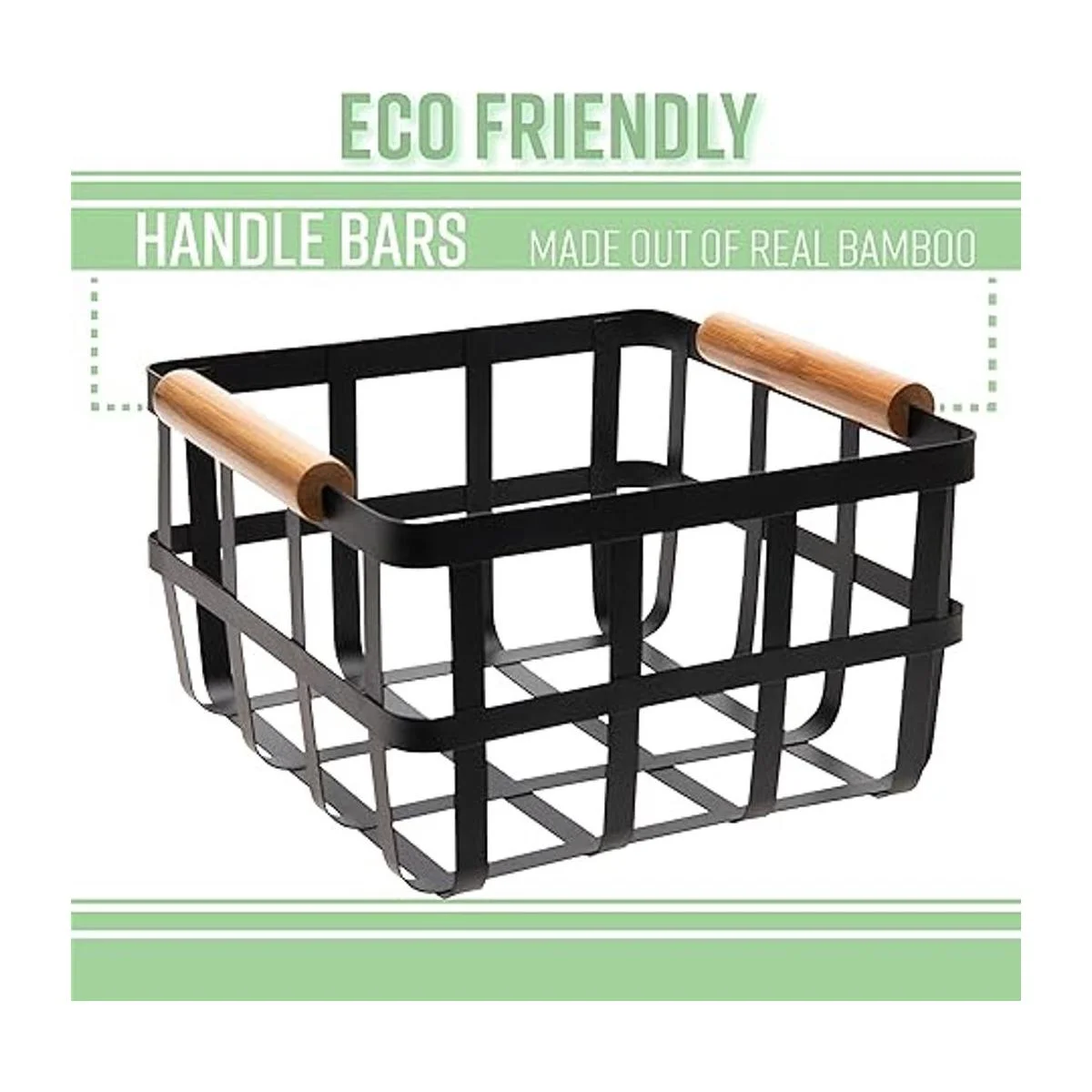 Simplify Cesta de almacenamiento cuadrada de metal con asas de bambú Mediana, cesta de alambre estilo granja Organizador para el hogar decorativo, rústico, negro
