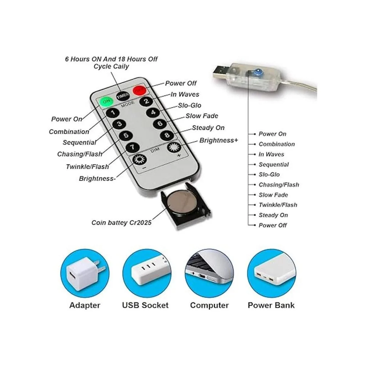 Cadena de luces de cobre con control remoto USB de 8 modos: cada modo te traerá un ambiente romántico diferente. incluyendo combinación, en ondas, secuencial, persecución/flash, desvanecimiento lento, centelleo/flash y encendido constante. Y recordará la configuración cuando se encienda la próxima vez. Alimentado por USB, que se puede utilizar conectándolo a la computadora, banco de energía o interfaz USB. Bajo voltaje de 5 V para que se pueda tocar de forma segura. 6 horas encendido y 18 horas apagado automáticamente cada 24 horas una vez activado el temporizador.