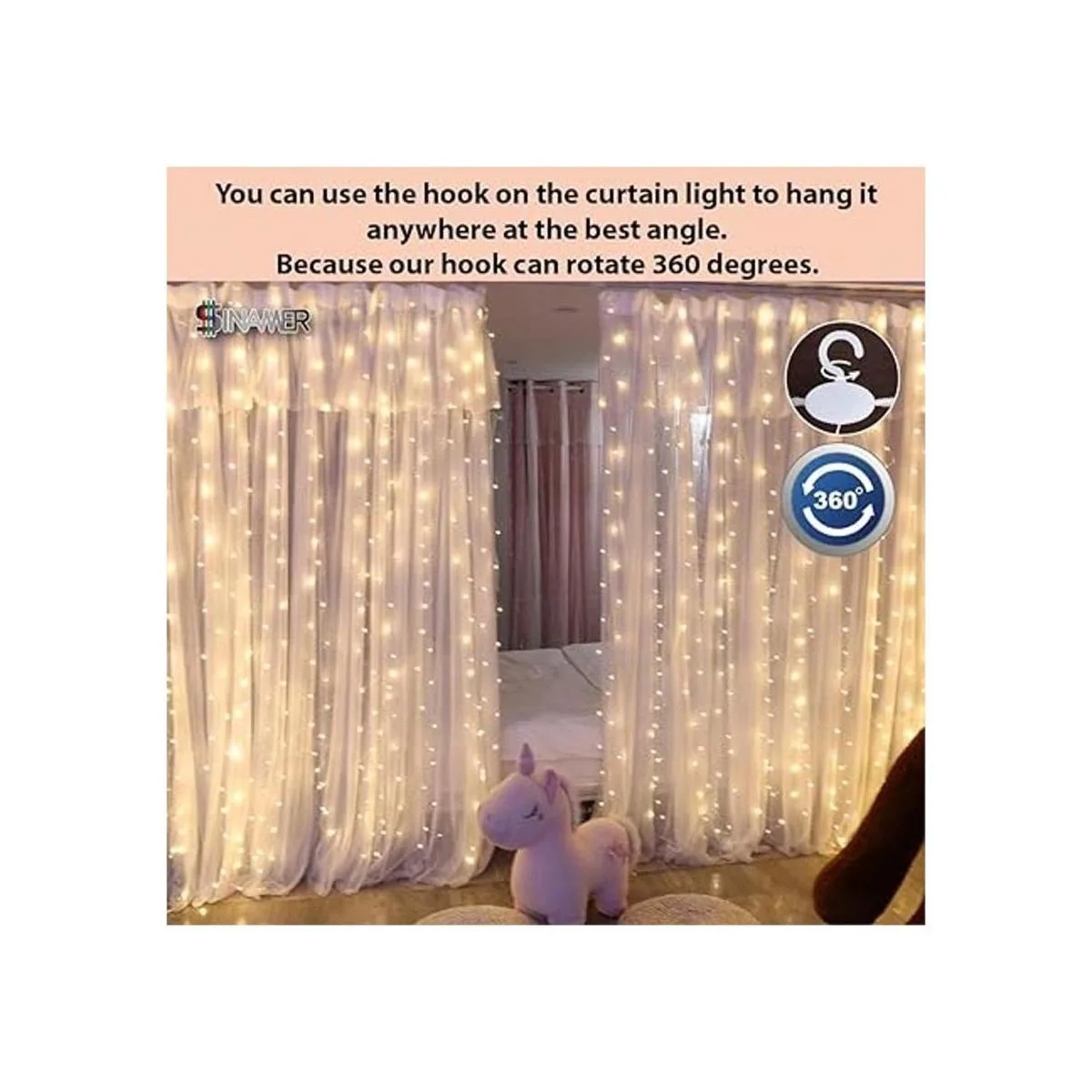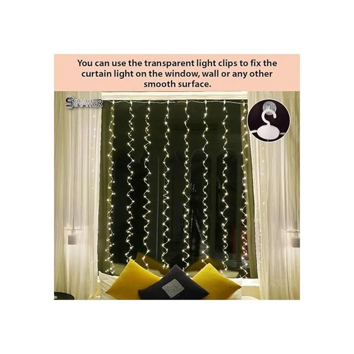 SINAMER Cortina de luz blanca para dormitorio, 300 luces LED de 9.8 x 9.8 pies con 16 ganchos, 8 modelos de control remoto, luz de hadas de ventana con USB para bodas, fiestas, hogar, jardín, decoración de interiores