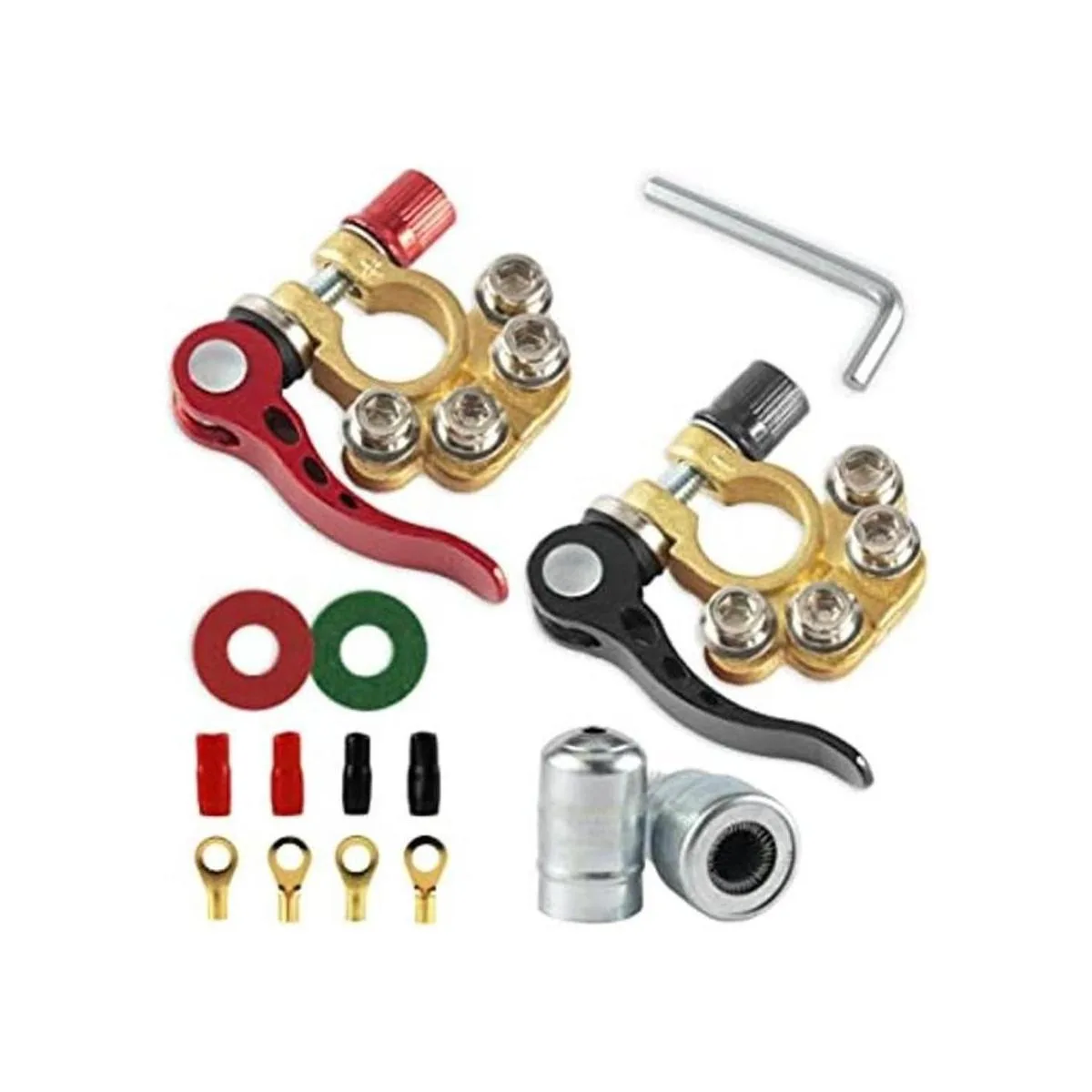 Lo que obtienes: el paquete contiene 2 conectores de terminal de batería positivo y negativo, 4 fundas de aislamiento, 4 bloques de terminales, 1 limpiador de terminales de batería, 2 arandelas anticorrosión de batería y una llave hexagonal.