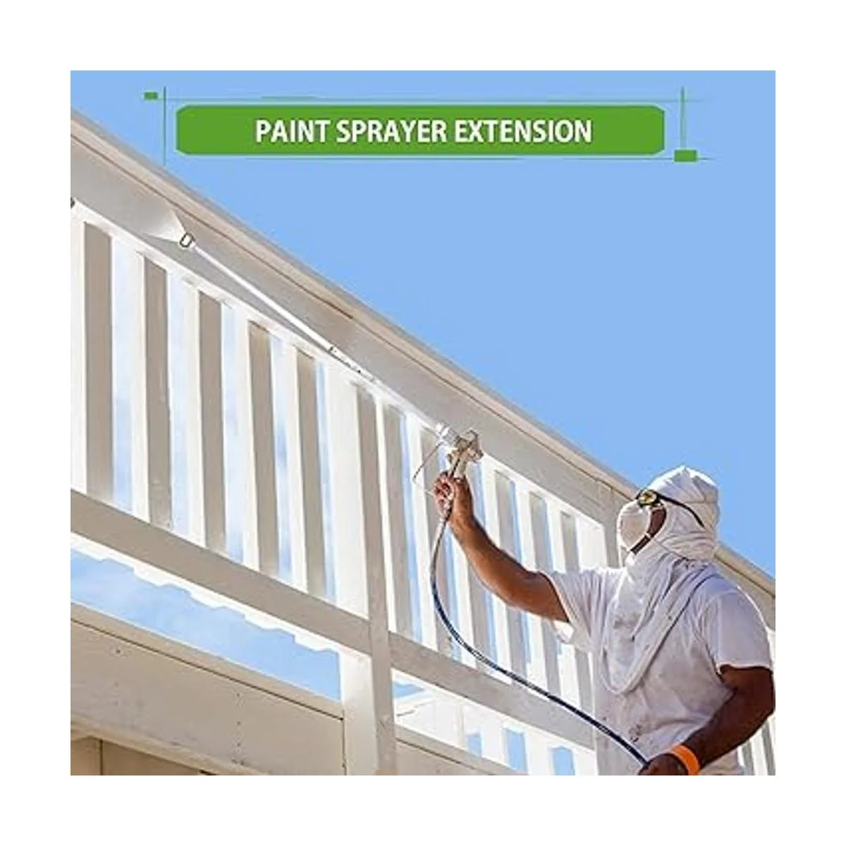 Amplia aplicación: utilizando extensiones de pulverizador de pintura sin aire, mantén las manos y el cuerpo lejos de la punta, alivia la presión antes de limpiar o desmontar. La extensión de punta del pulverizador puede rociar áreas altas, bajas o empotradas como techos, escaleras, paredes altas, salientes o cubiertas reduciendo la necesidad de escaleras o herramientas de escalones.