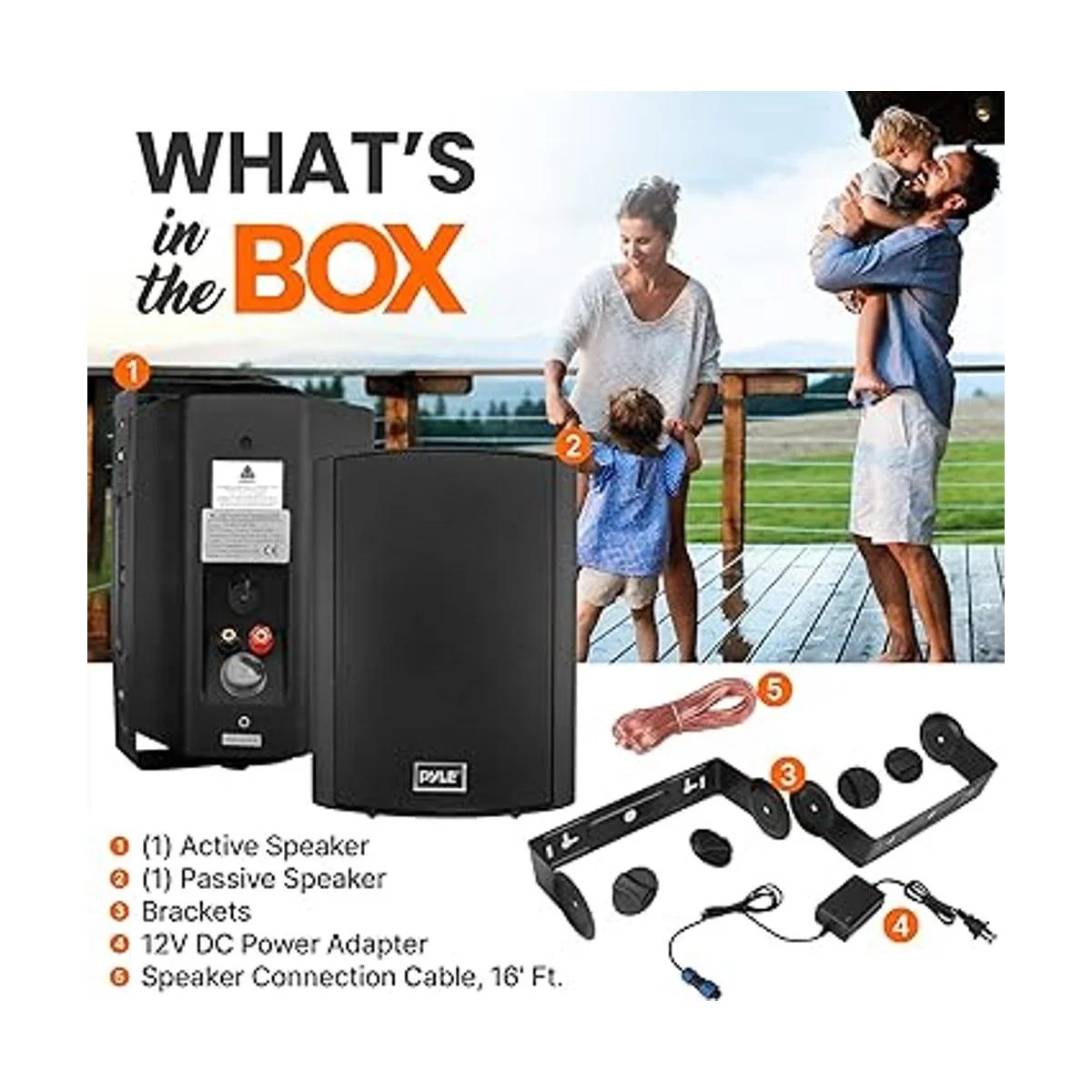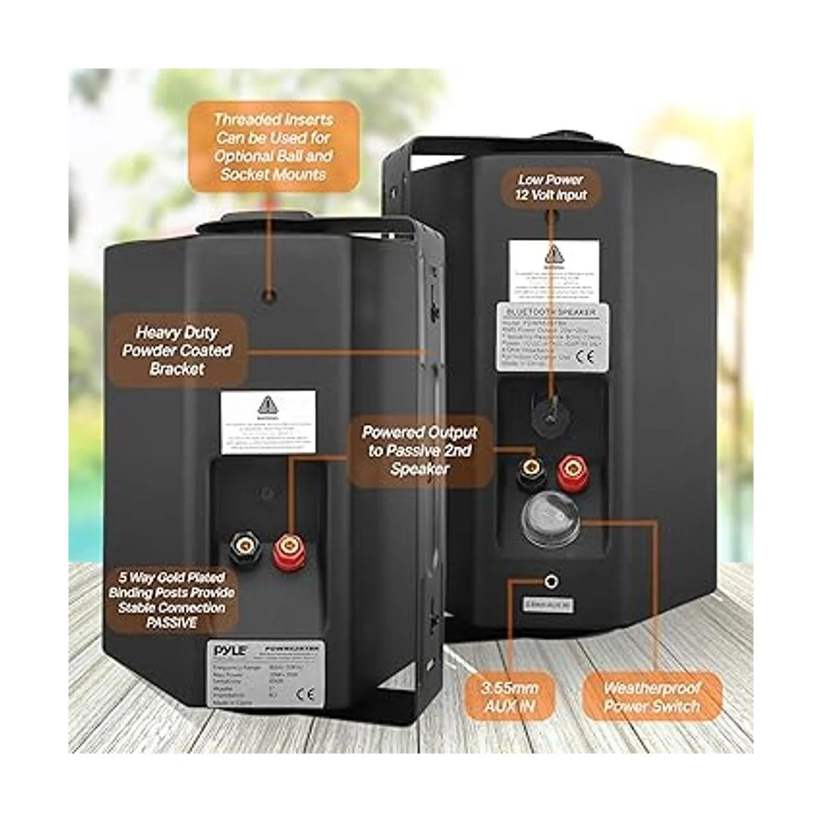 Sistema de altavoces para el hogar de montaje en pared, par activo pasivo, inalámbrico, compatible con Bluetooth, para interiores y exteriores, impermeable, resistente a la intemperie, juego de altavoces de sonido estéreo con entrada AUX Pyle PDWR52BTBK negro, 5.25 pulgadas