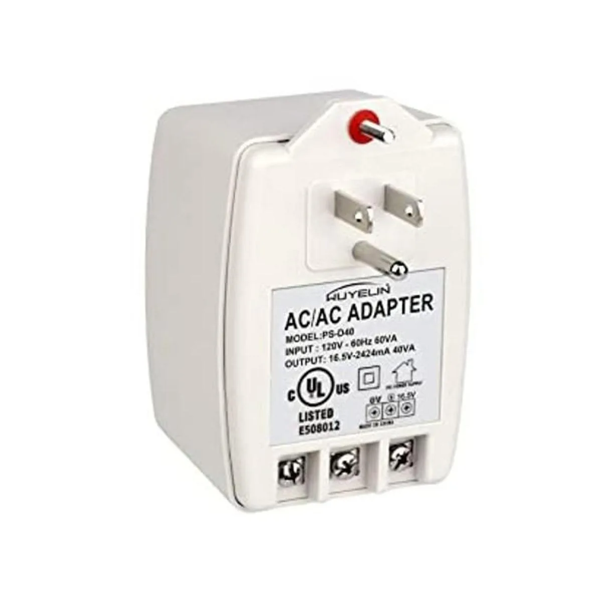 Especificaciones: Voltaje de entrada: 120 VAC, 60 Hz; Voltaje de salida: 16,5 V, 40 VA seguro y estable de reinicio automático PTC fusionado secundario, indicador de alimentación LED verde
