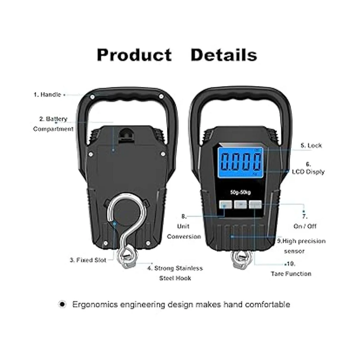Fácil de usar: esta báscula digital portátil con mango de plástico suave extra ancho es fácil de llevar al aire libre, y la retroiluminación LCD azul con bloqueo de datos te hace fácil leer el valor durante el día y la noche. La báscula colgante funciona con 2 pilas AAA incluidas para tu comodidad.