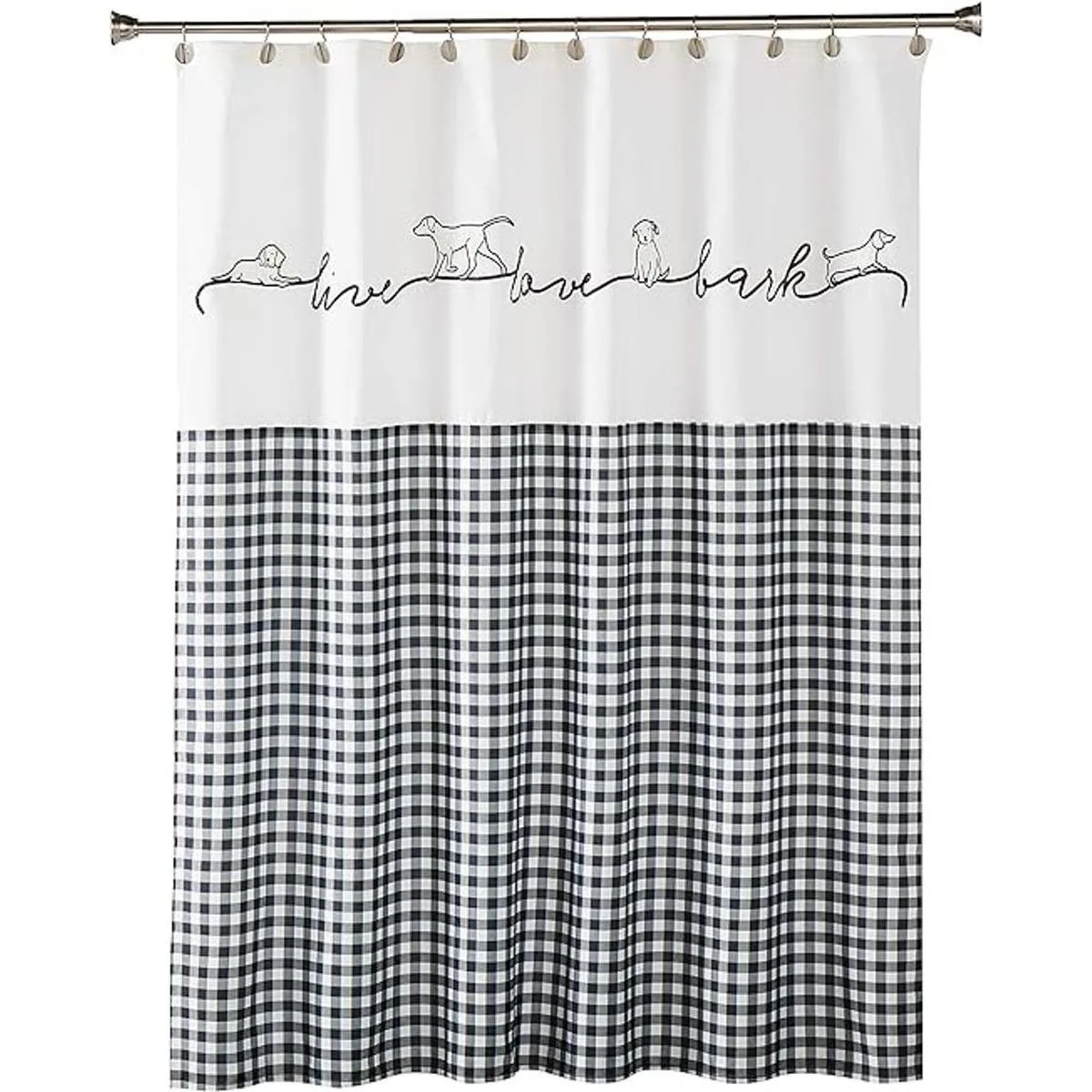 Cortina de ducha impresa y de piezas con cinta aplicada con palabras y apliques y bordado