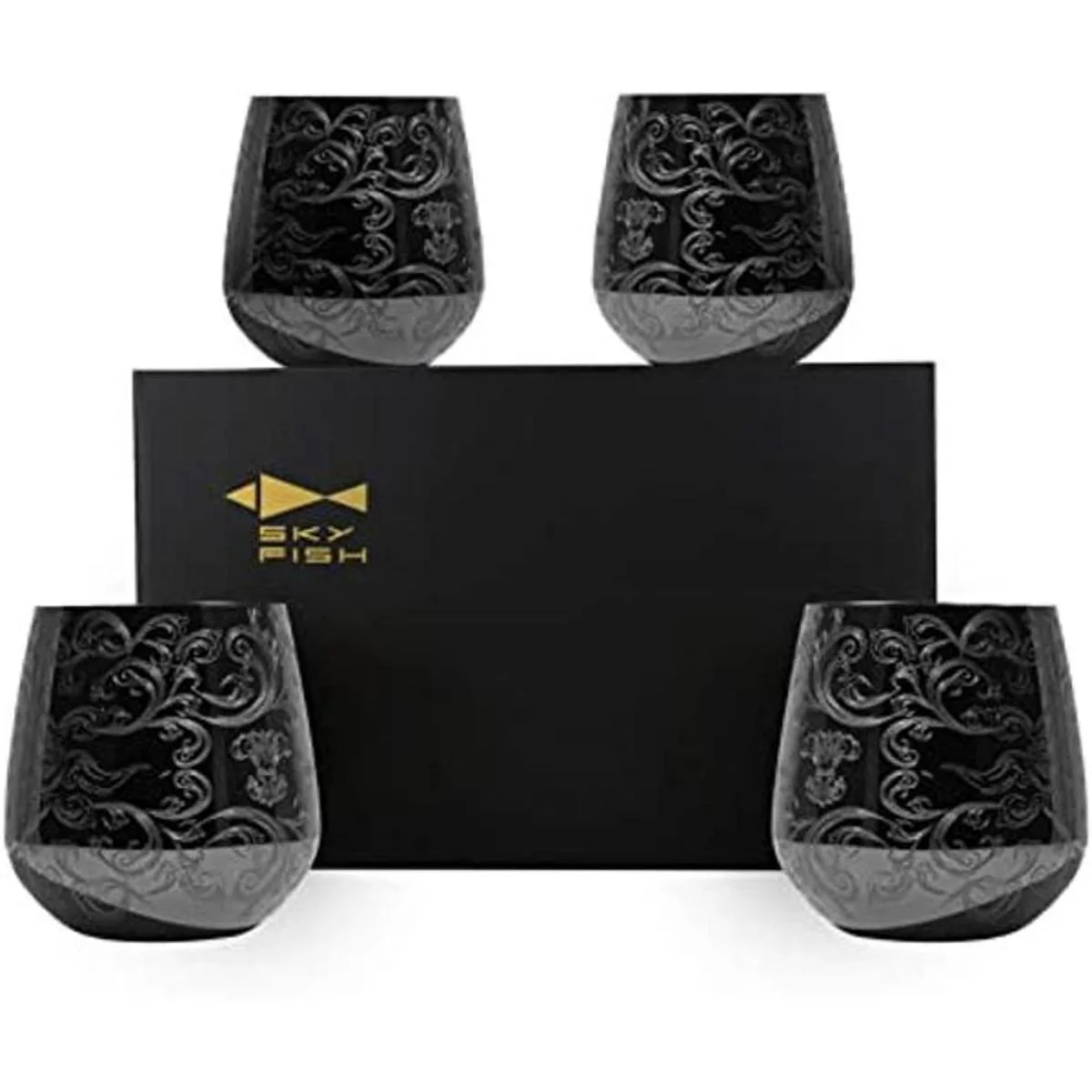 SKY FISH Stemless Stainless Steel Etching Wine Glasses,18 oz Black Plated,Set Of 4