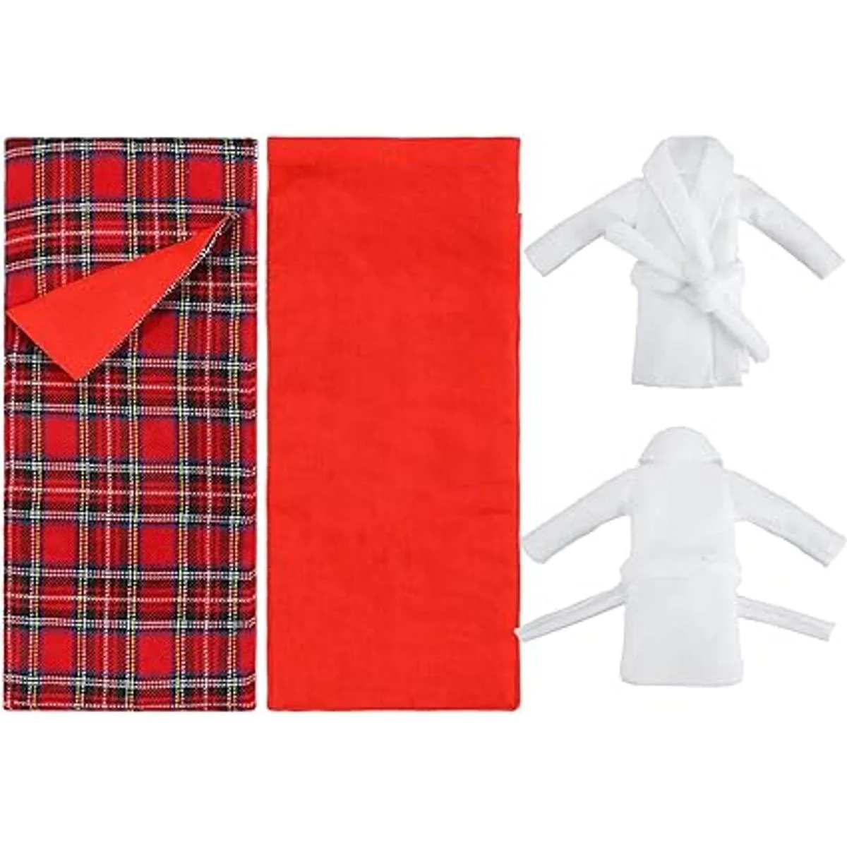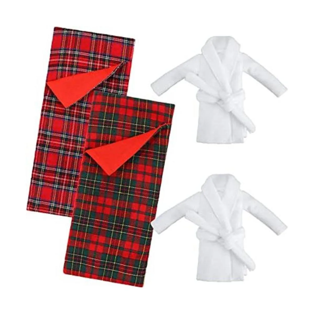 Skylety 2 sacos de dormir navideños, accesorio para muñeca de elfo, muñeco de elfo, saco de dormir a cuadros rojo y verde y 2 batas de baño blancas para decoración de muñecas de elfo muñeca no incluida