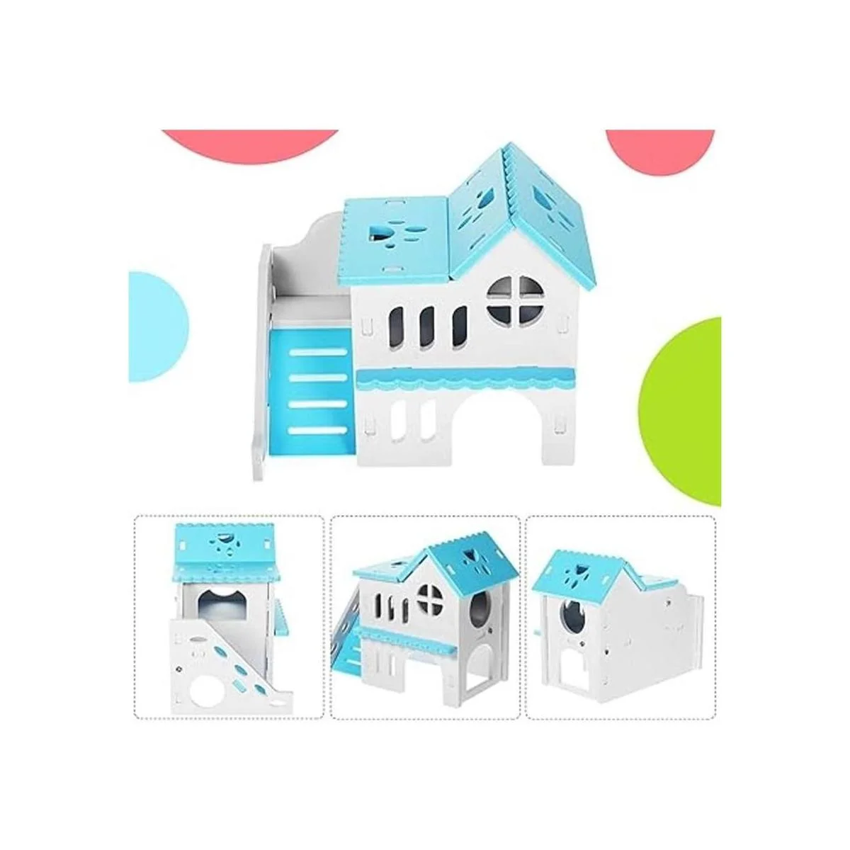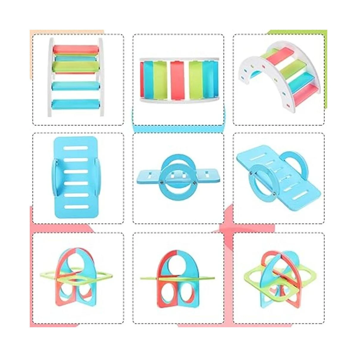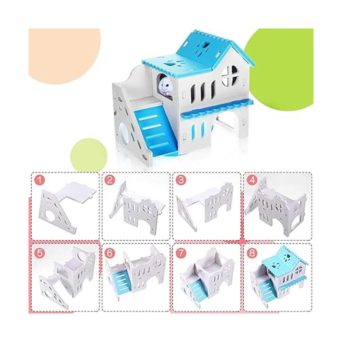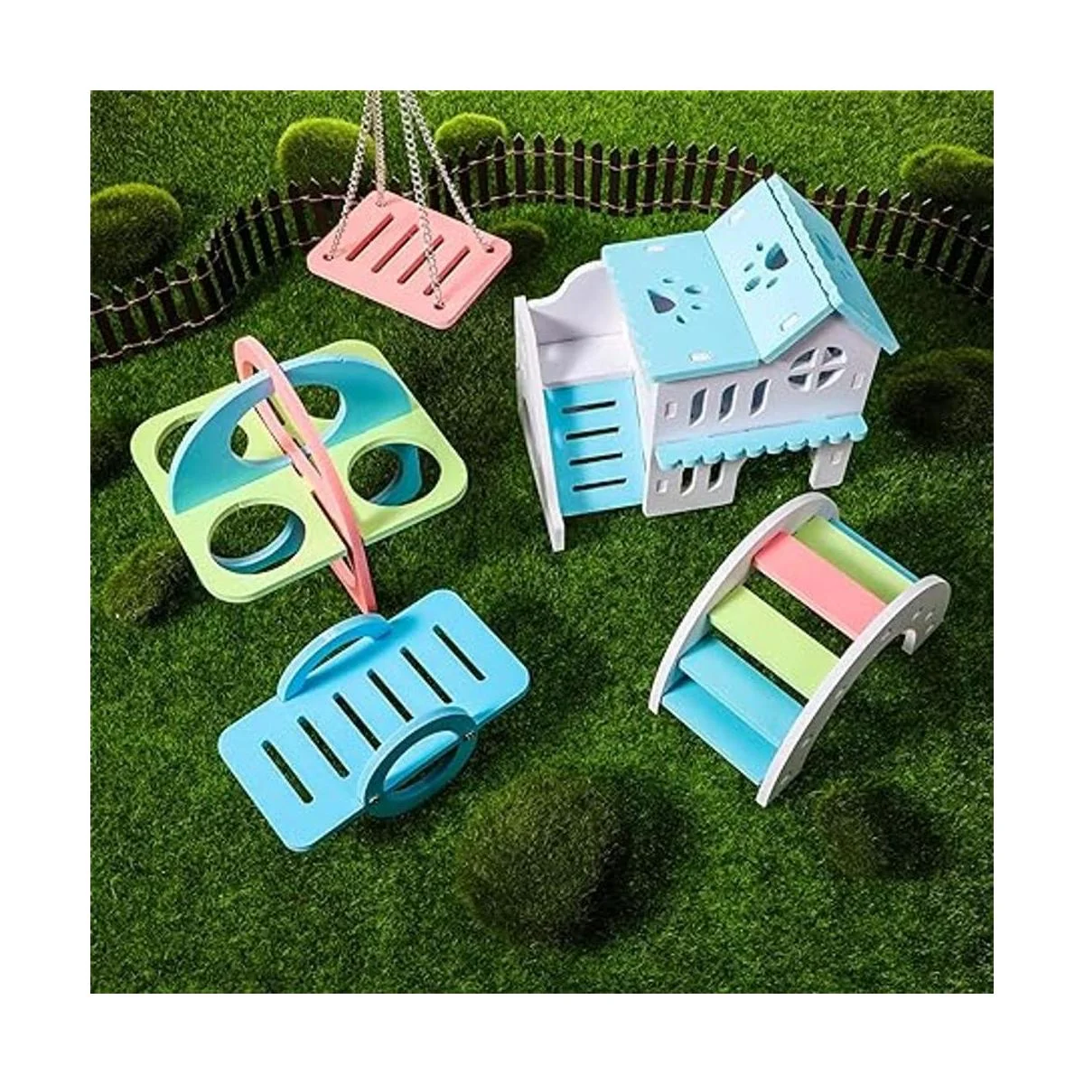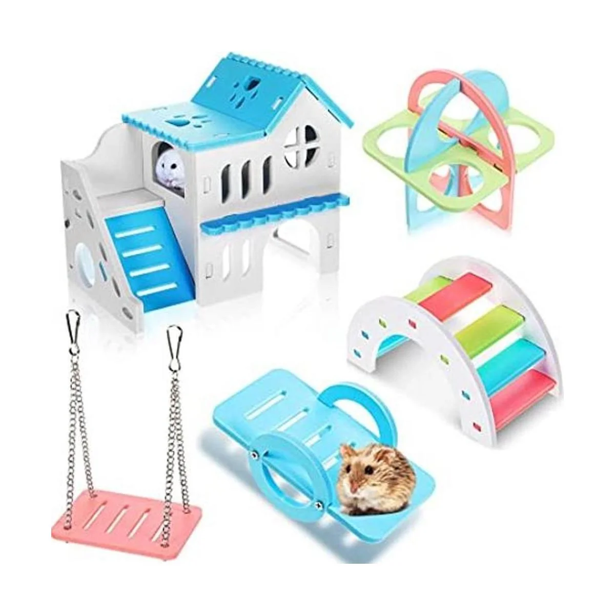 Recibirás: viene con 5 piezas de juguete para hámster, incluyendo 1 casa de hámster de doble capa, 1 balancín, 1 puente arcoíris, 1 columpio y 1 juguete de círculo de ejercicio para hámster; este juego de juguetes para hámster es adecuado para accesorios de jaula; diferentes juguetes harán que los hámsters se diviertan