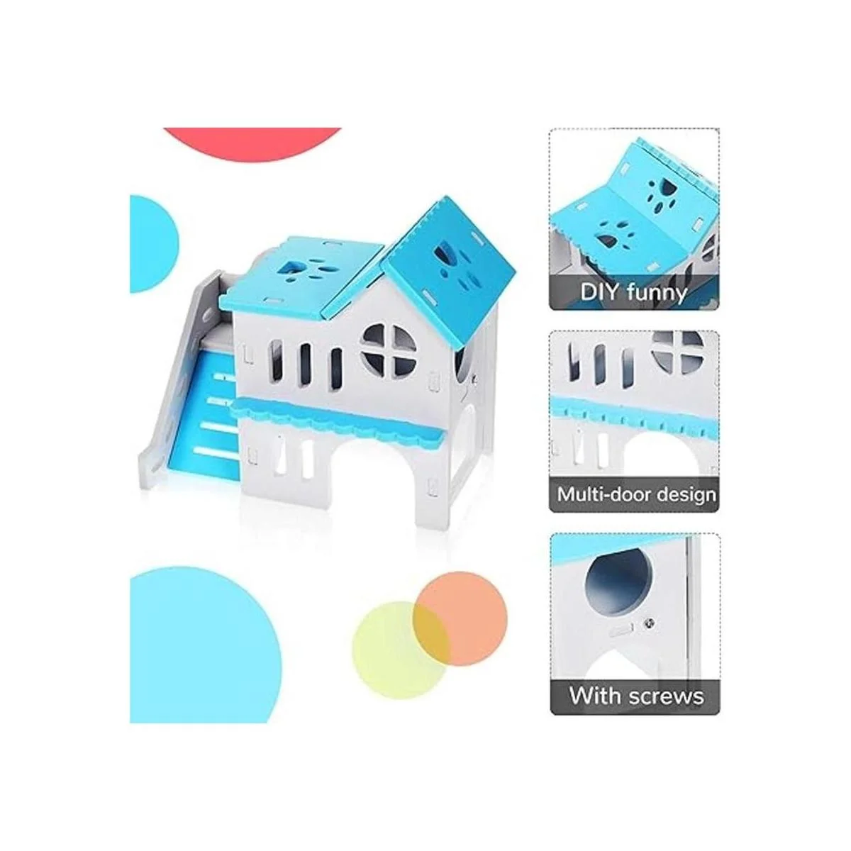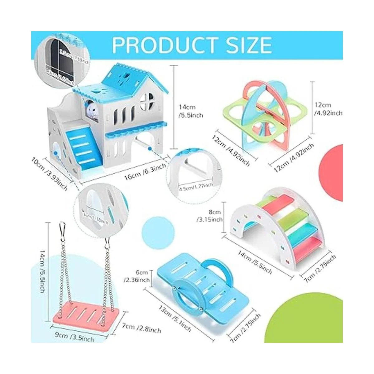 Tamaño adecuado: el tamaño de la casa de hámster es de 6.3 x 3.93 x 5.5 pulgadas, el puente arcoíris es de 5.5 x 2.75 x 3.15 pulgadas, el balancín es de 5.1 x 2.75 x 2.36 pulgadas, el columpio es de 3.5 x 2.8 x 5.5 pulgadas y el círculo de ejercicio es de 4.5 pulgadas x 4.9 2 x 4.92 pulgadas; el juego contiene destornillador y tornillos, que son más estables y no se caen fácilmente, adecuado para hámsteres pequeños, ratones, jerbos y otras mascotas pequeñas