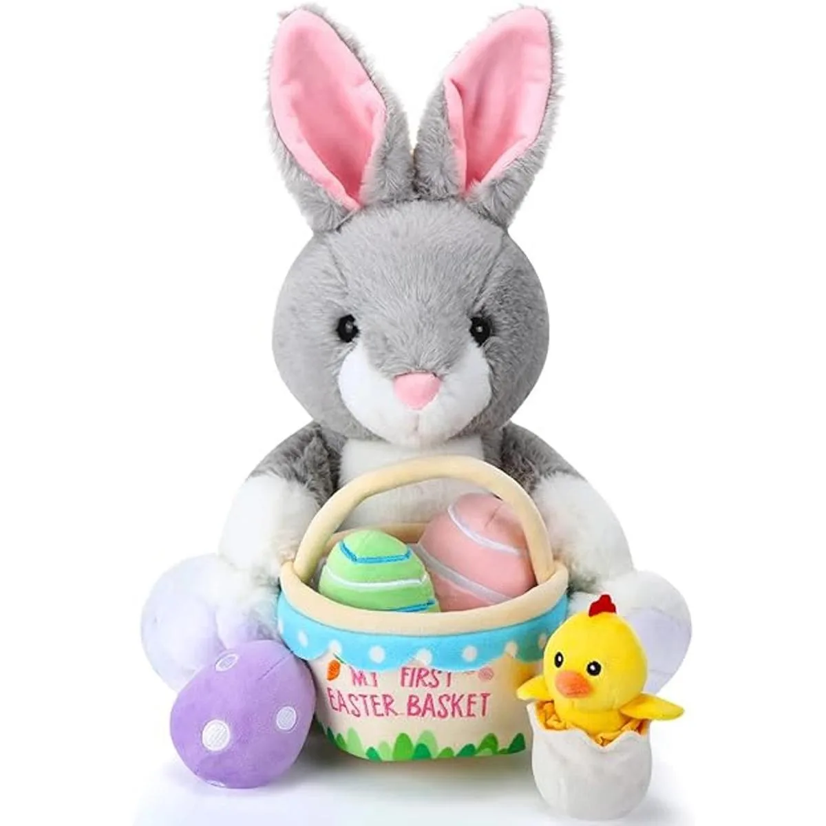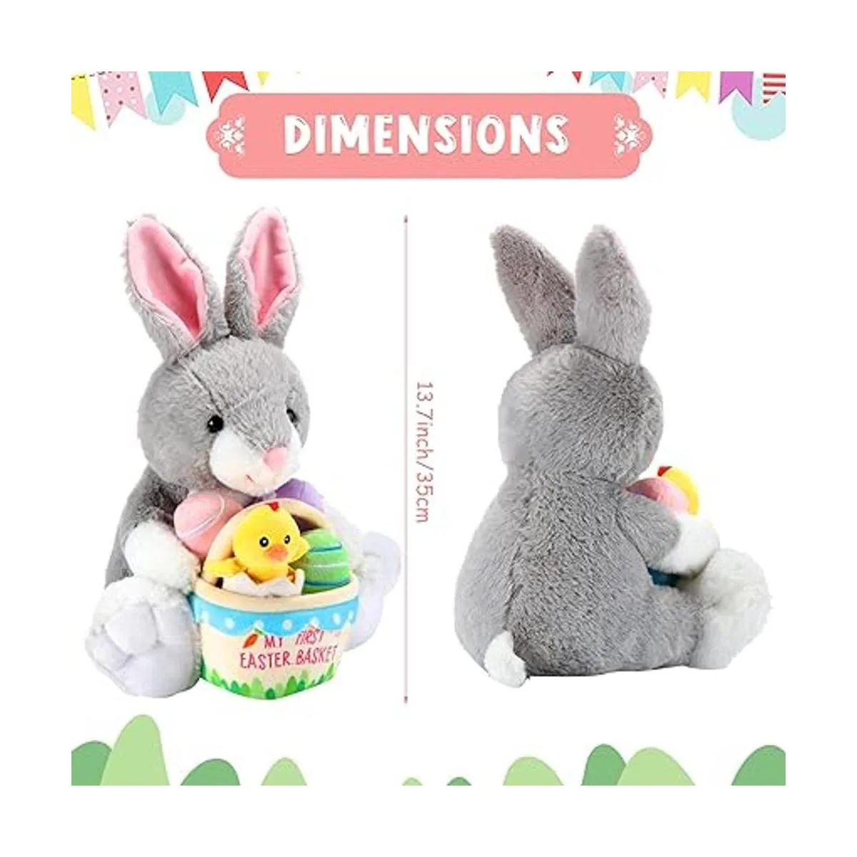 Skylety Conejo de Pascua de 13.7 pulgadas con cesta de peluche de orejas largas, conejo de pie, cesta de Pascua con huevos de pollito, juguetes para decoraciones de cumpleaños, fiestas de vacaciones