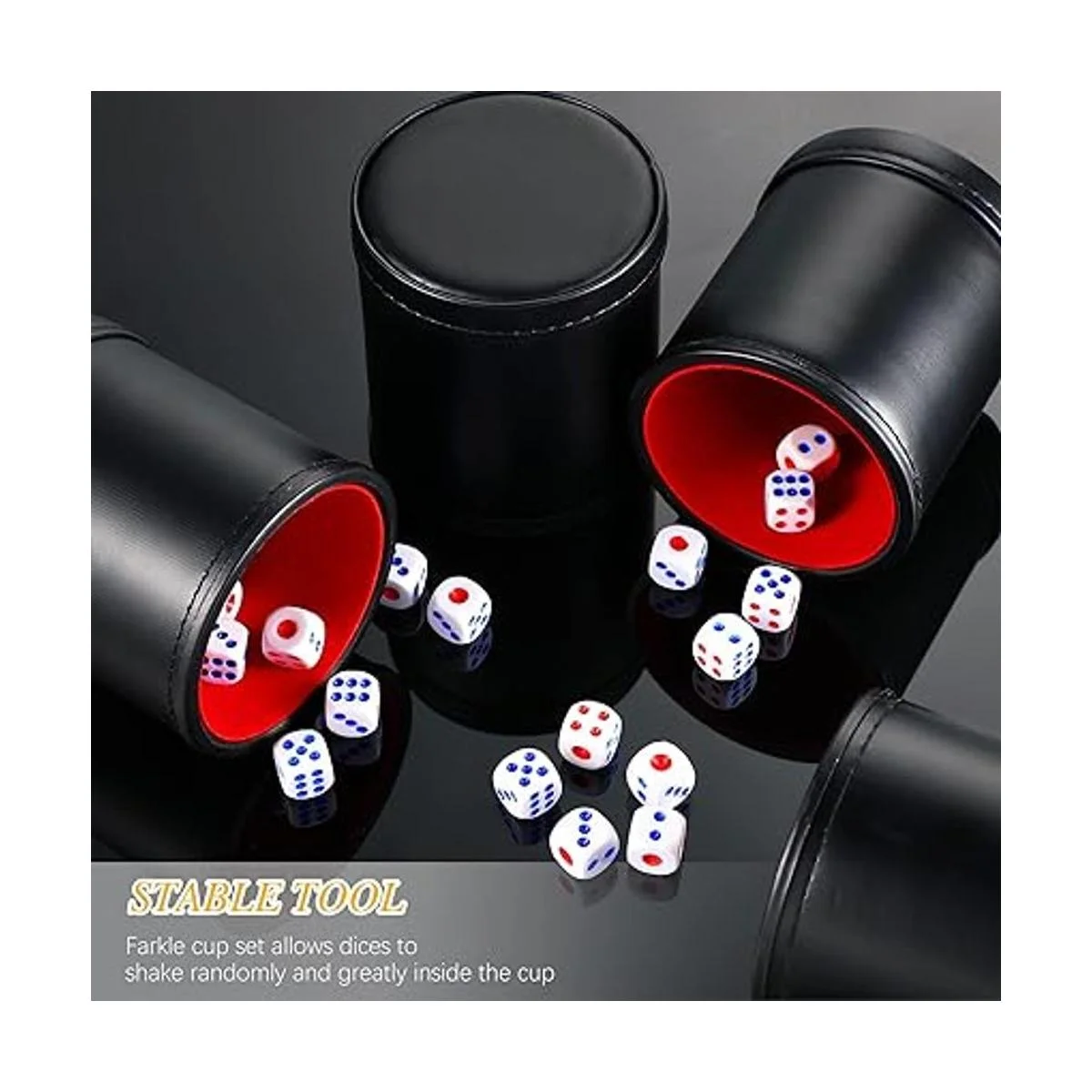 Material de calidad: las tazas de dados están hechas de piel sintética negra de calidad y forradas con terciopelo rojo, por lo que son duraderas para servirte durante mucho tiempo, lo que te da una buena sensación de uso y te trae más diversión