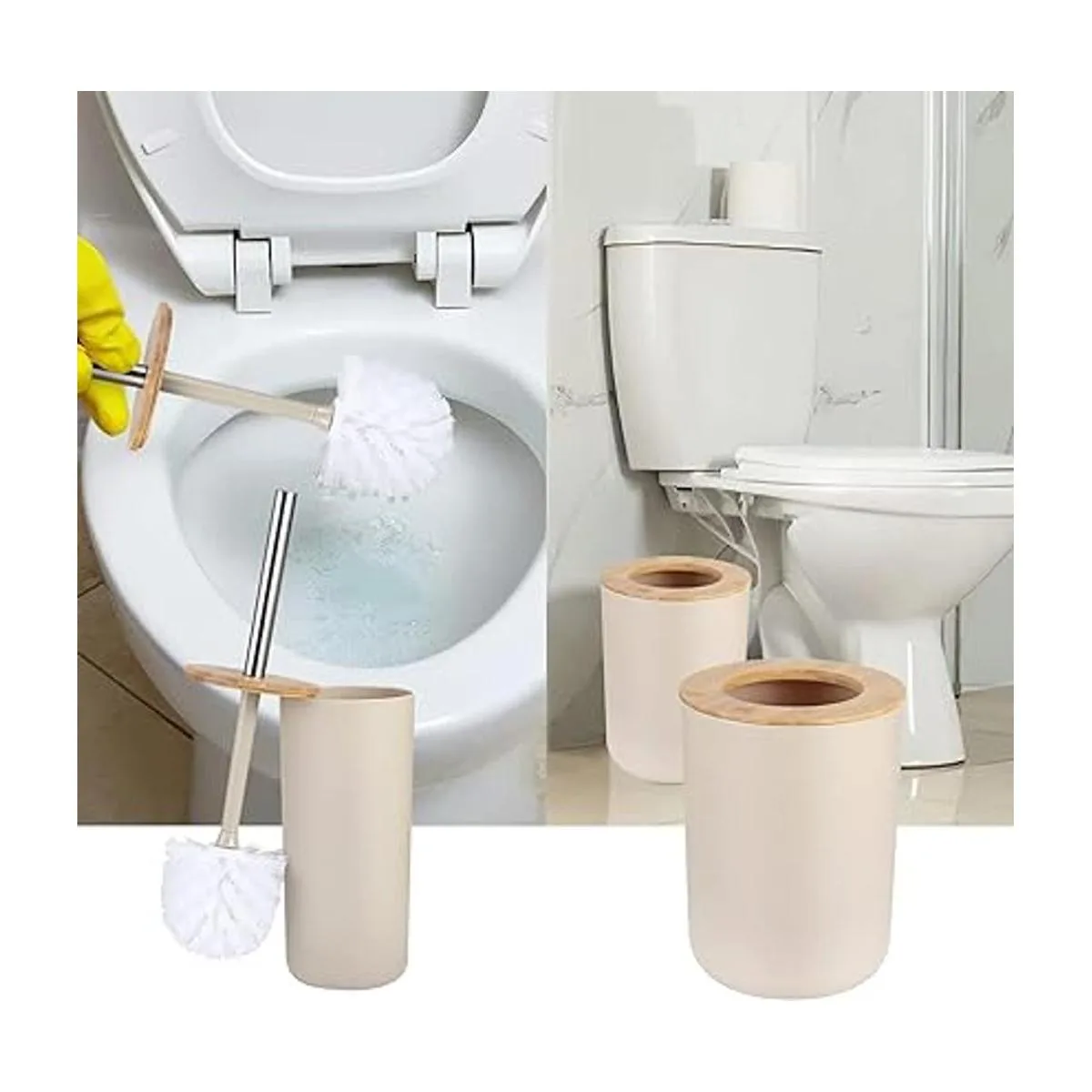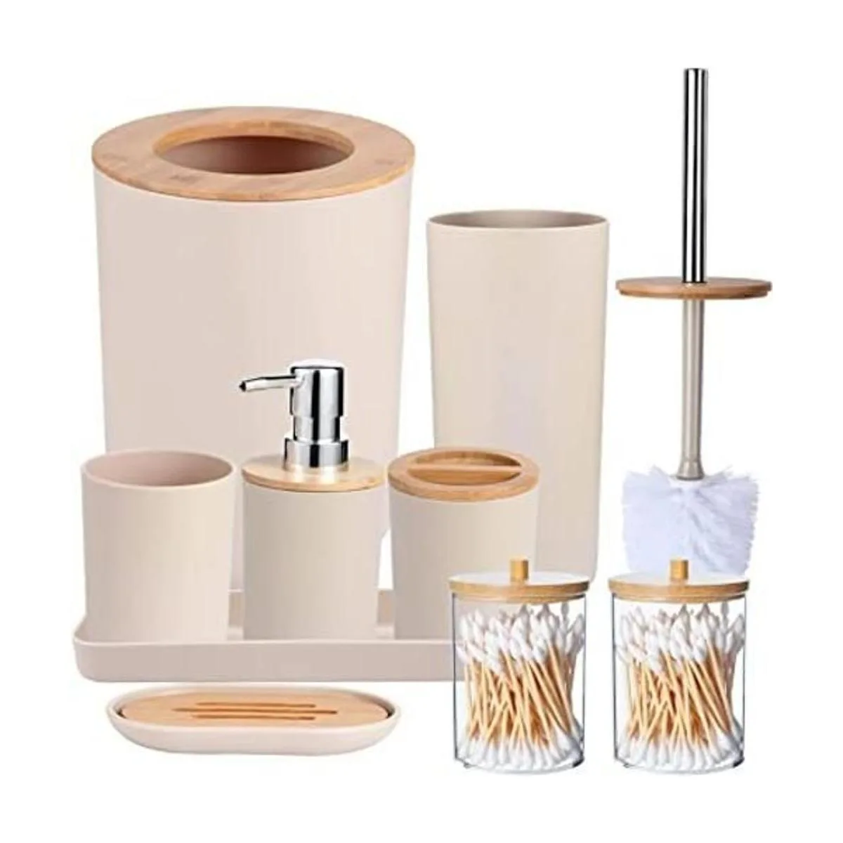 SLDIYWOW Juego de 8 accesorios de baño beige, juego de accesorios de baño de plástico con botellas de loción, soporte para cepillos de dientes, taza para cepillo de dientes, jabonera, cepillo de inodoro, cubo de basura y soportes para Qtip