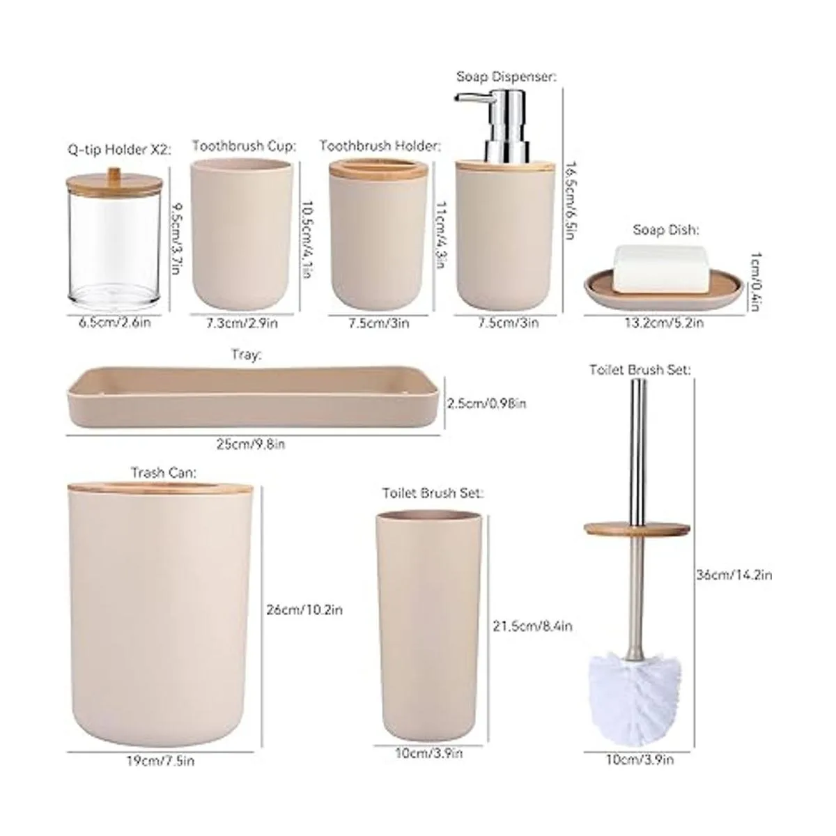 Juego de accesorios de baño: juego de 8 accesorios de baño beige, incluye 1 soporte para cepillo de dientes, 1 taza para cepillo de dientes, 1 dispensador de jabón, 1 jabonera, 1 soporte para cepillo de inodoro, 1 cubo de basura y 2 soportes para punta en Q que obtendrás todo lo que necesitas para tu baño.