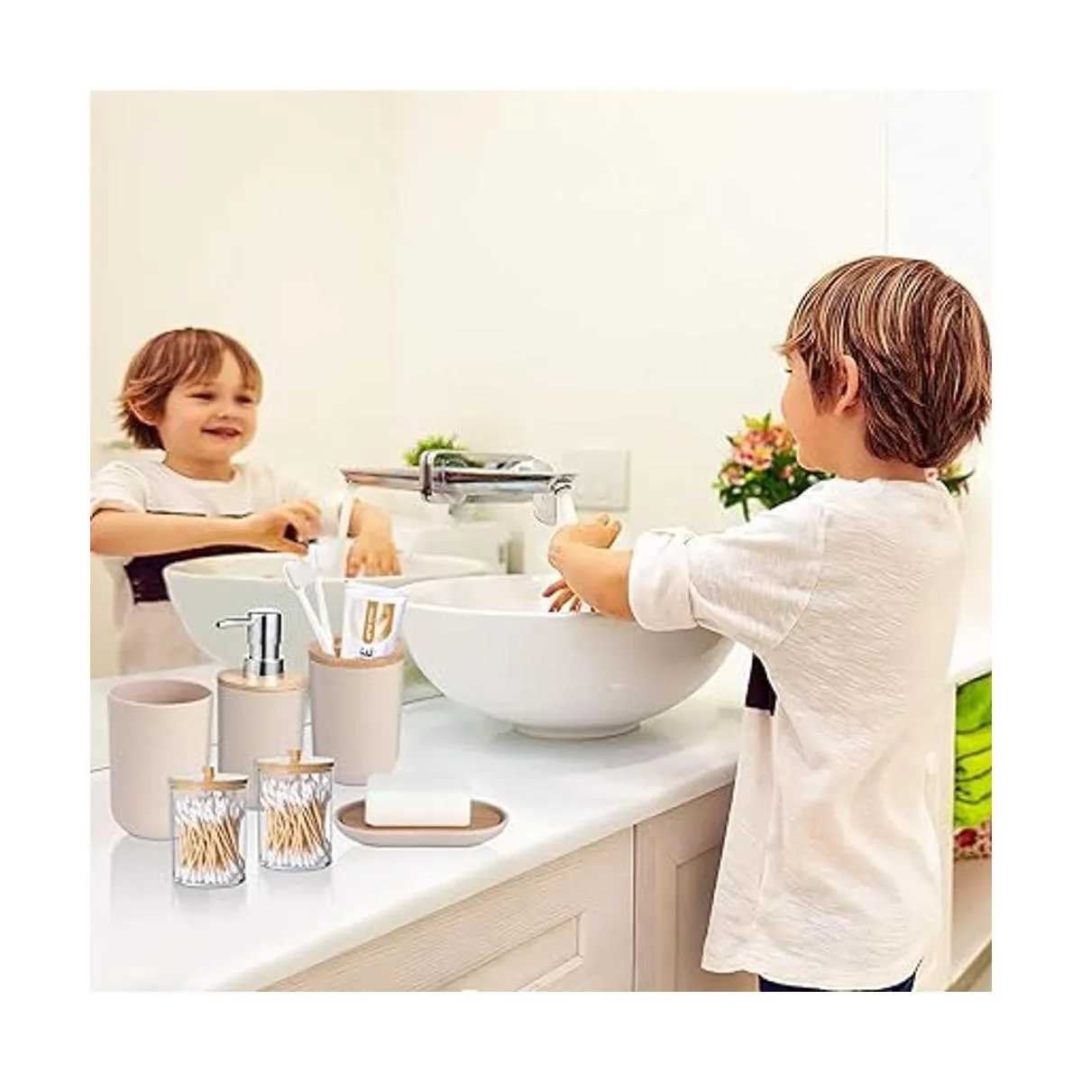 Diseño elegante: hecho de madera de bambú natural y ABS, ligero pero duradero, no es fácil de romper, para garantizar tu satisfacción a largo plazo, este juego de accesorios de baño se puede integrar elegantemente en cualquier entorno de baño, aportando un nuevo estilo y grado.