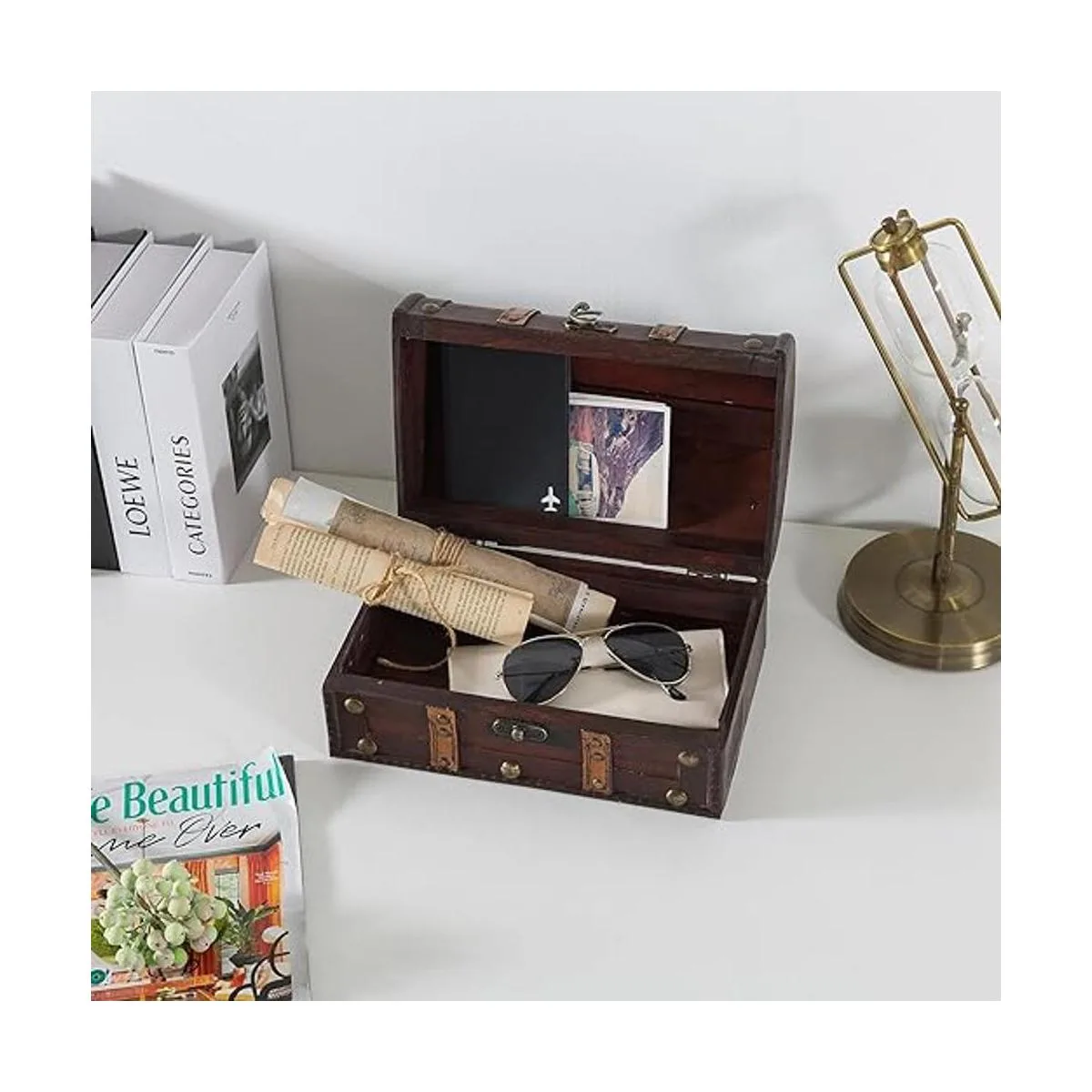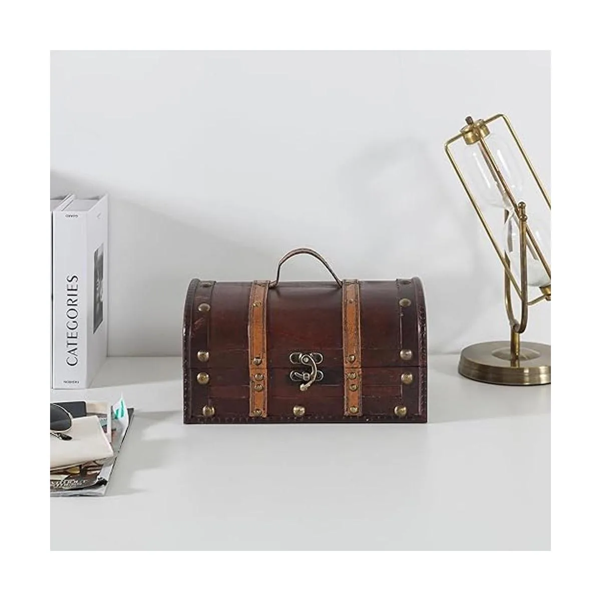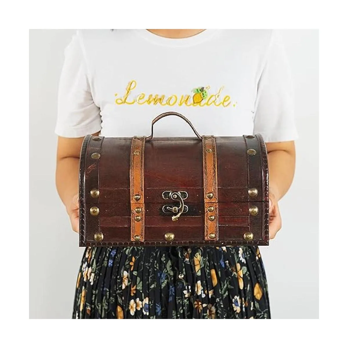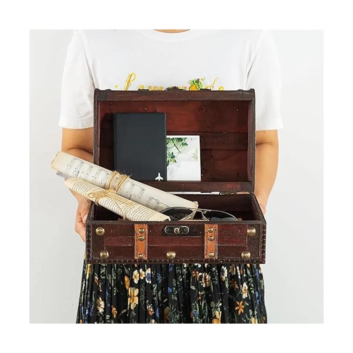Añade atractivo vintage a cualquier habitación: esta caja de madera de estilo vintage añade interés visual a cualquier habitación. Con correas decorativas y un mango de piel sintética, esta caja decorativa añade un toque encantador a cualquier oficina o estudio. Coloca nuestra caja de recuerdos debajo de una mesa de café de cristal o en un estante de oficina para almacenar suministros de oficina adicionales, tinta de impresora o cargadores móviles.
