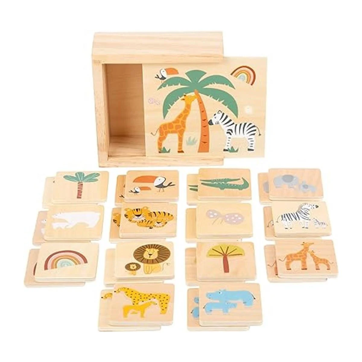 small foot 11696 Memory Safari, hecho de madera con motivos de animales en colores de moda, con 28 tarjetas de memoria, para edades de 3 años