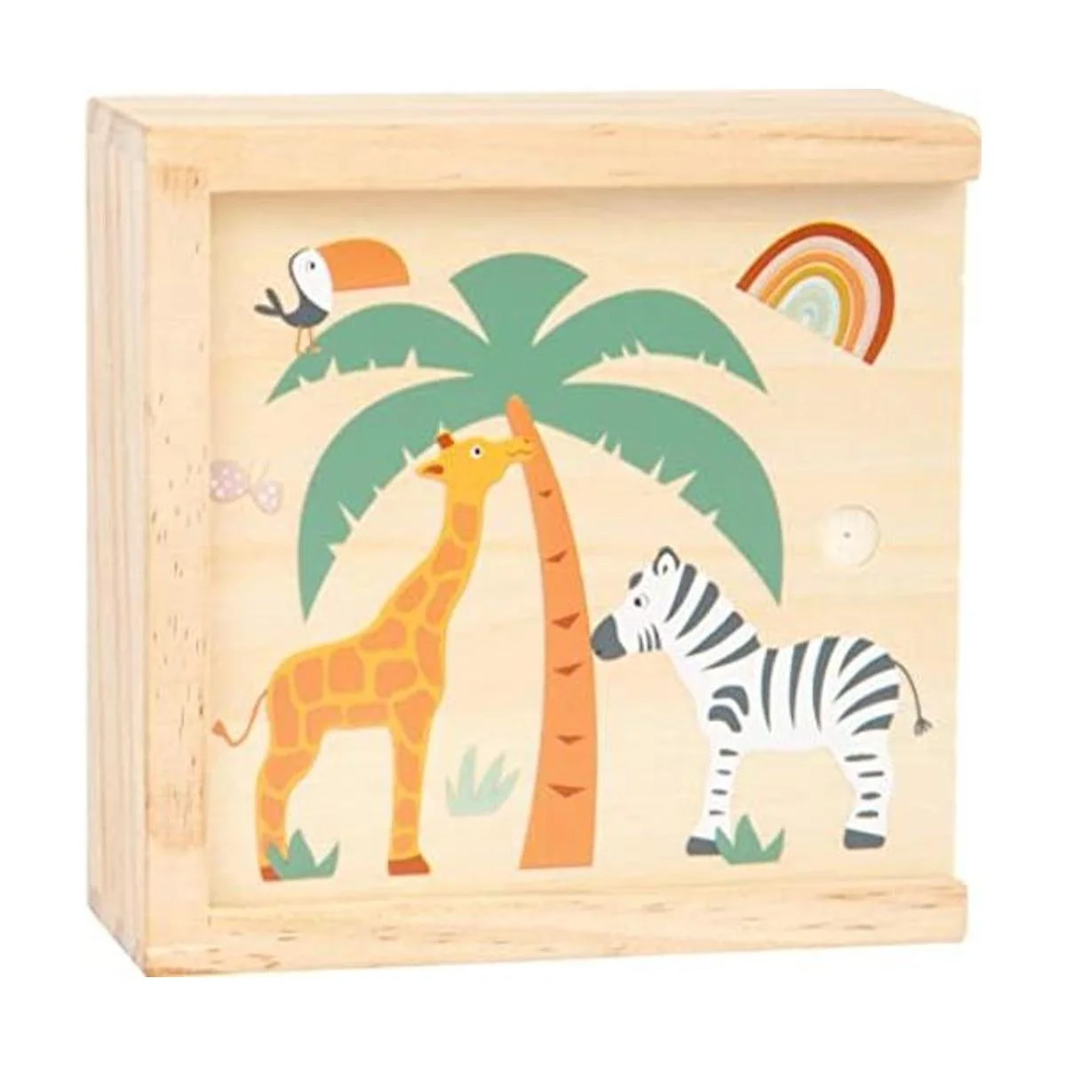 Los pequeños azulejos de madera para niños representan bonitos motivos de safari en colores de moda para que los niños puedan sumergirse en el mundo aventurero de los animales salvajes paso a paso.