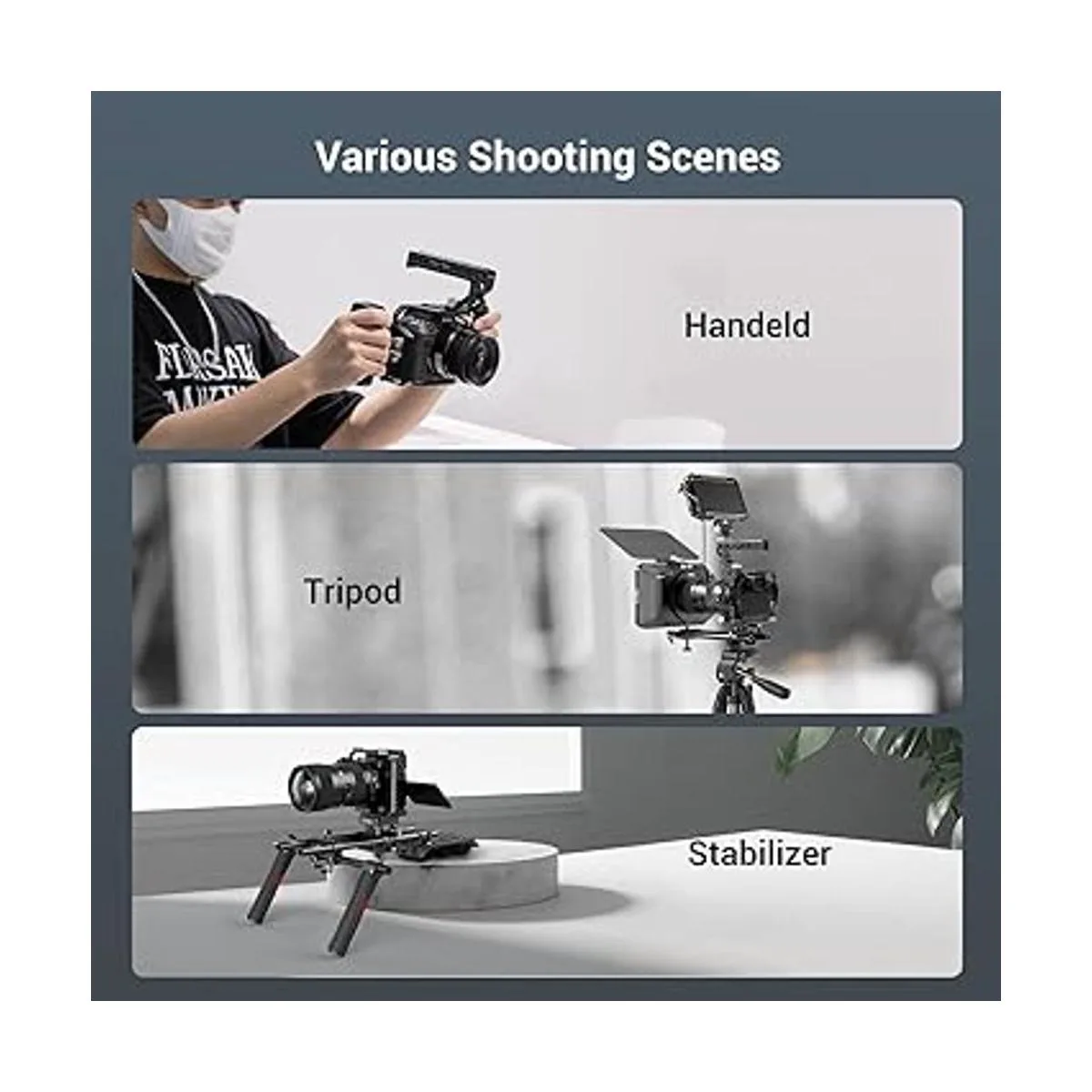 Interfaz versátil: viene con múltiples agujeros roscados de 1/4 pulgadas, agujeros roscados de 3/8 pulgadas y agujero de localización de 3/8 para el estándar ARRI que permite el montaje de accesorios. El mango superior Smallrig 1984 se puede fijar para disparar de mano. La abrazadera de cable SMALLRIG también se puede añadir para proteger el cable y el puerto HDMI