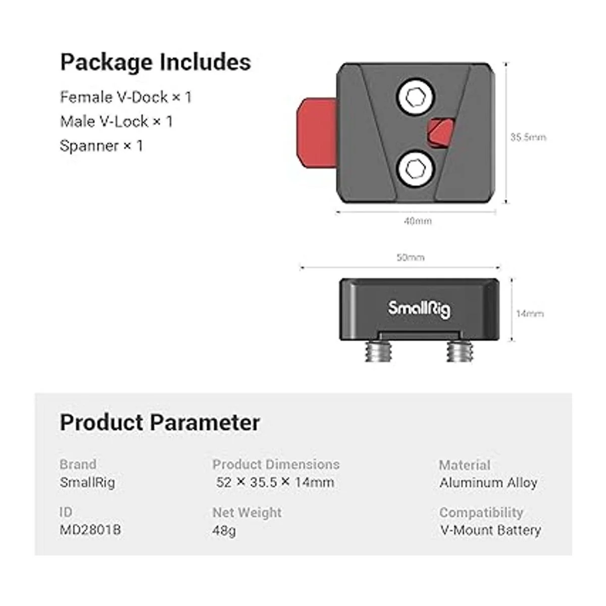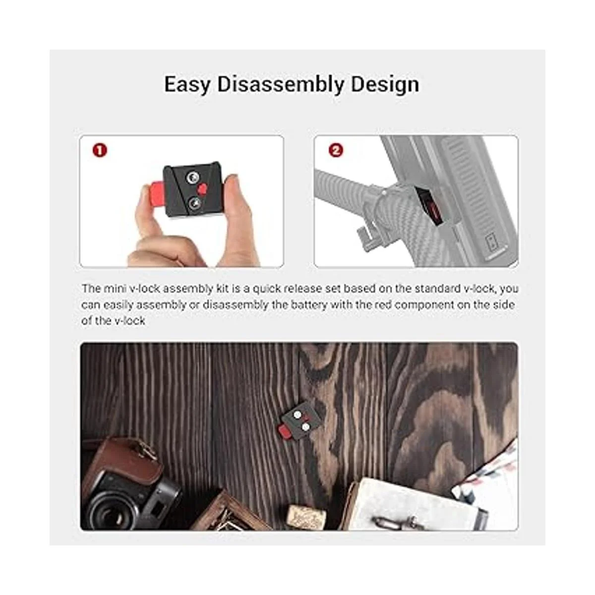 Ligero y portátil: pesa solo 1.69 oz, los dos componentes están hechos de aluminio duradero. Además, puedes montar este kit de montaje en la bisagra de batería SmallRig MD2802 que está diseñada para ajustar el ángulo de la batería con esta configuración para alimentar todos los accesorios, lo que minimiza el peso de la cámara.