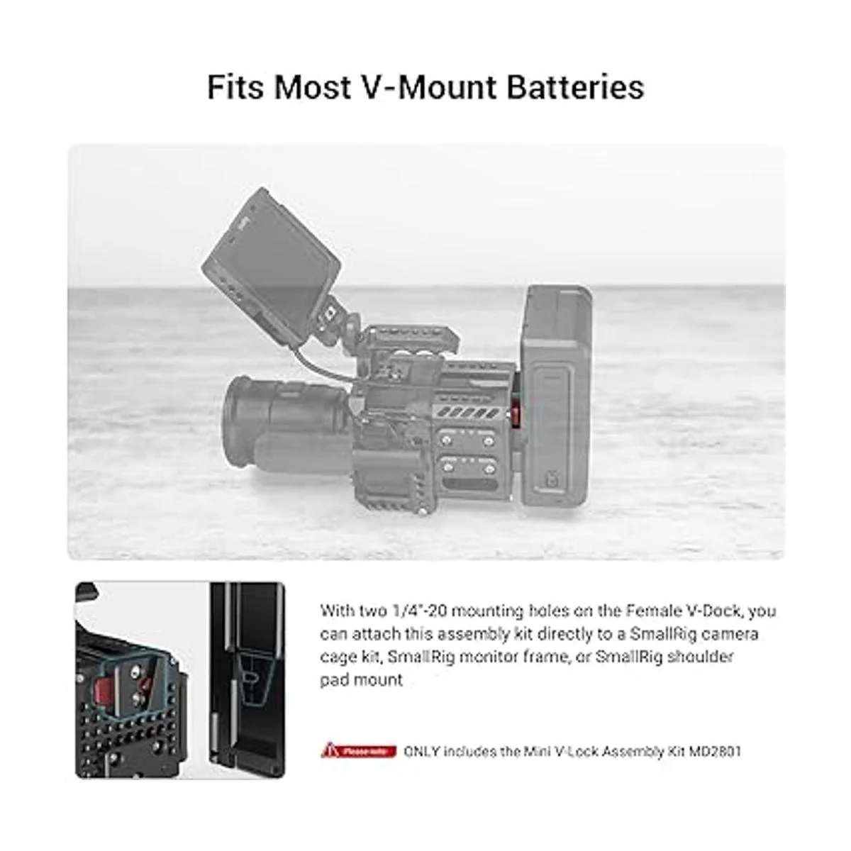 Viene con varias roscas de montaje: hay dos agujeros de montaje de 1/4 pulgadas 20 en la base V hembra, y puedes fijar este montaje directamente a un kit de jaula de cámara SmallRig para el marco de monitor SmallRig o soporte de almohadilla de hombro SmallRig El VLock con tres agujeros M3 se puede utilizar como reemplazo del VLock original viene con la batería VMount.