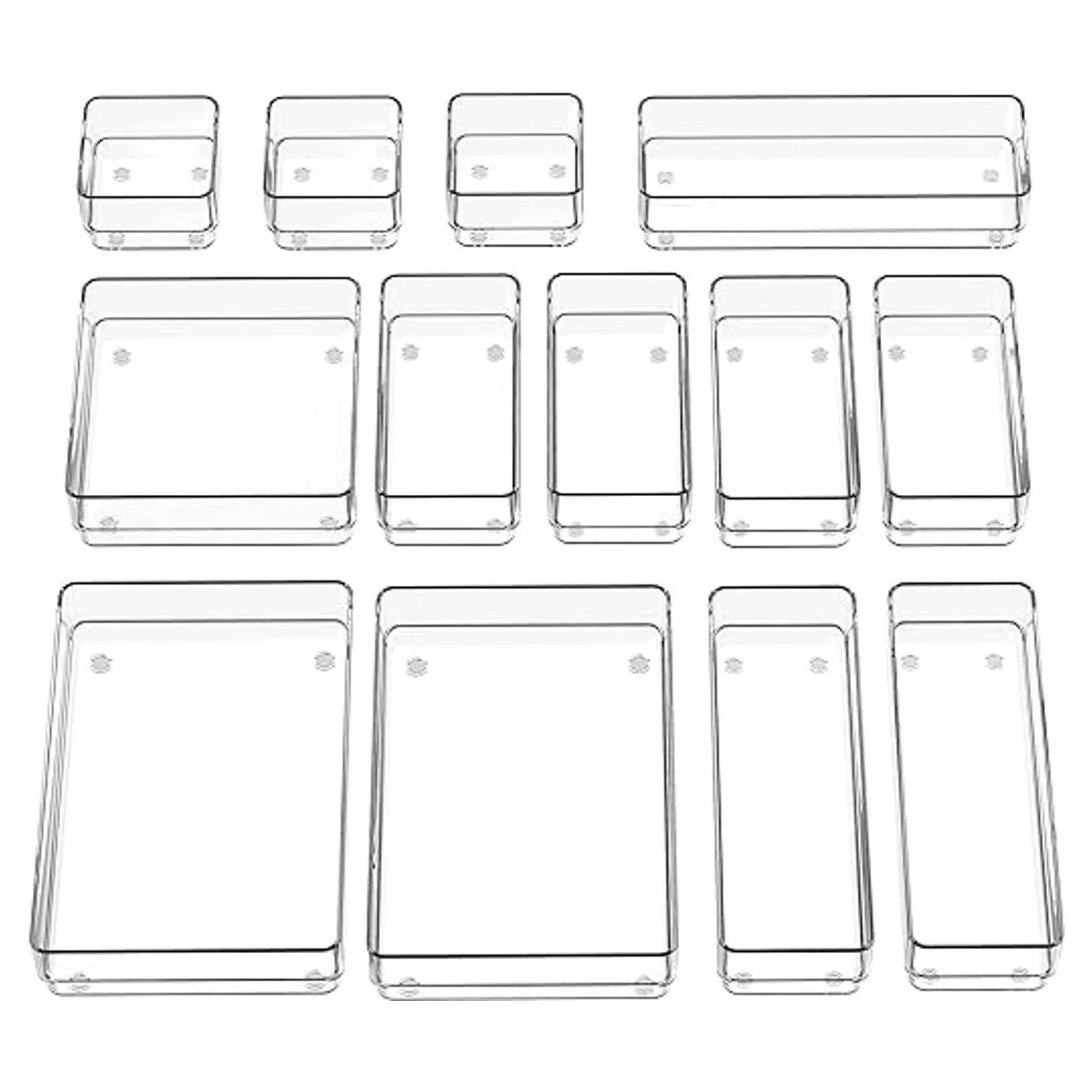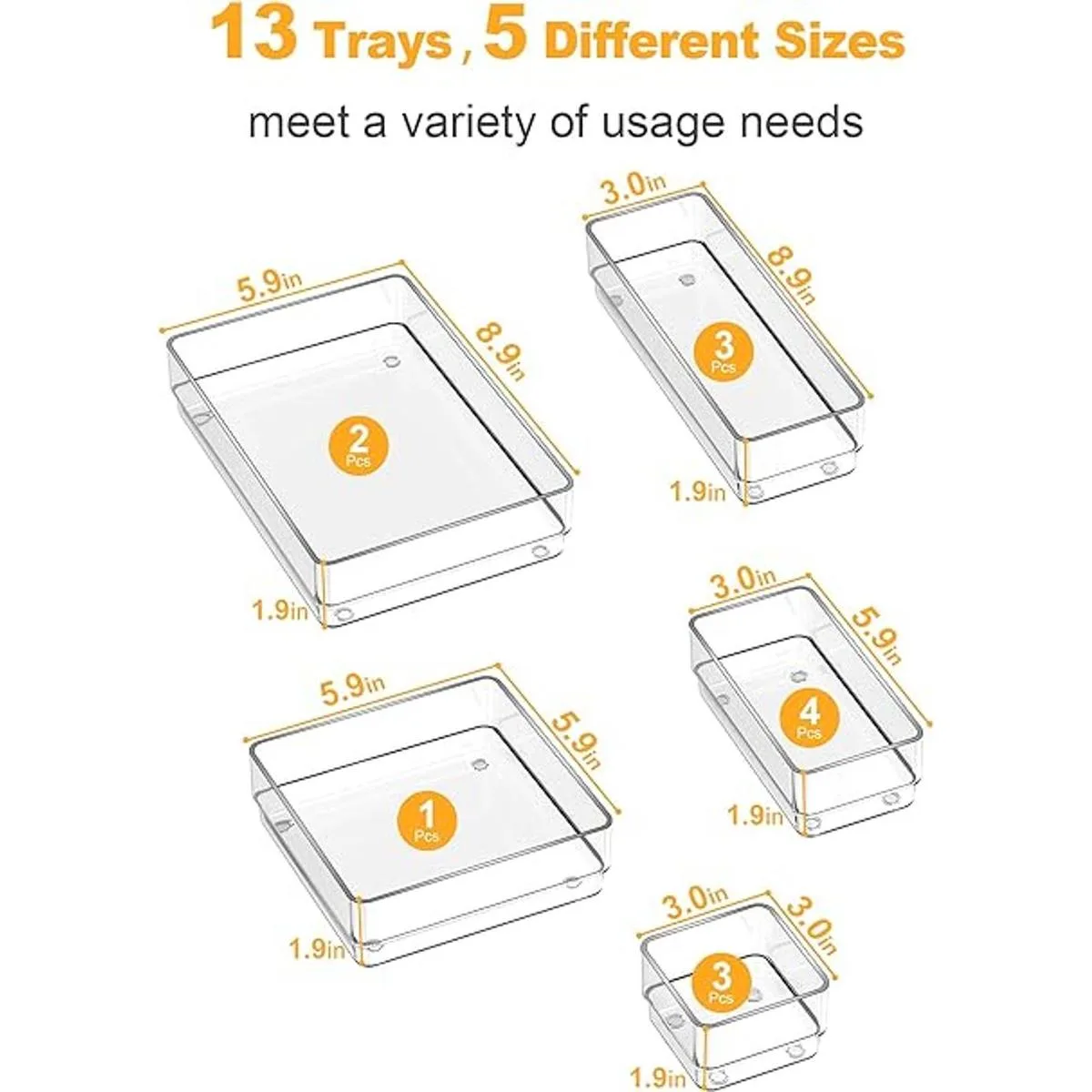 Multiple Sizes 5 different sizes and 13 pieces trays offer you customize combinations to store stuff and organize drawer for your specific needs. Size: 8.9 x 6 x 2 inches 2 pack, 8.9 x 3.3 x 2 inches3 pack, 5.9 x 5.9 x 2 inches1 pack, 5.9 x 2.9 x 2 inches4 pack, 3 x 3 x 2 inches3 pack.