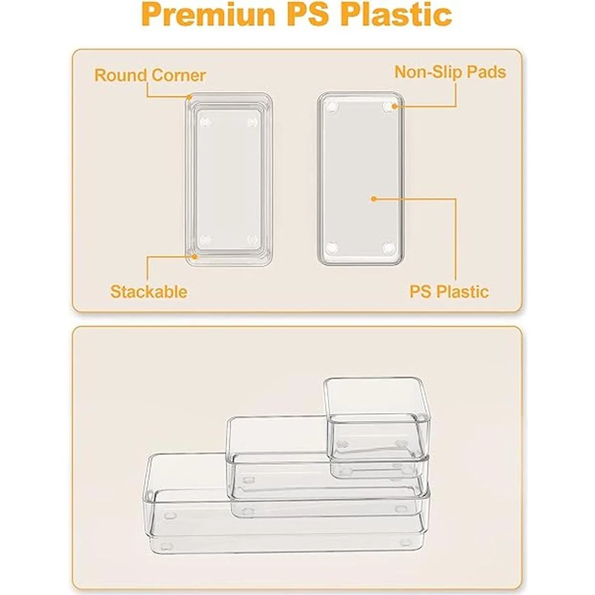 Durable and NonSlip Material The clear drawer organizers made by unbreakable plastic, ensure the long life of use. Silicone nonslip pads at the bottom of the bin prevent the box from moving freely when dragging the drawer.