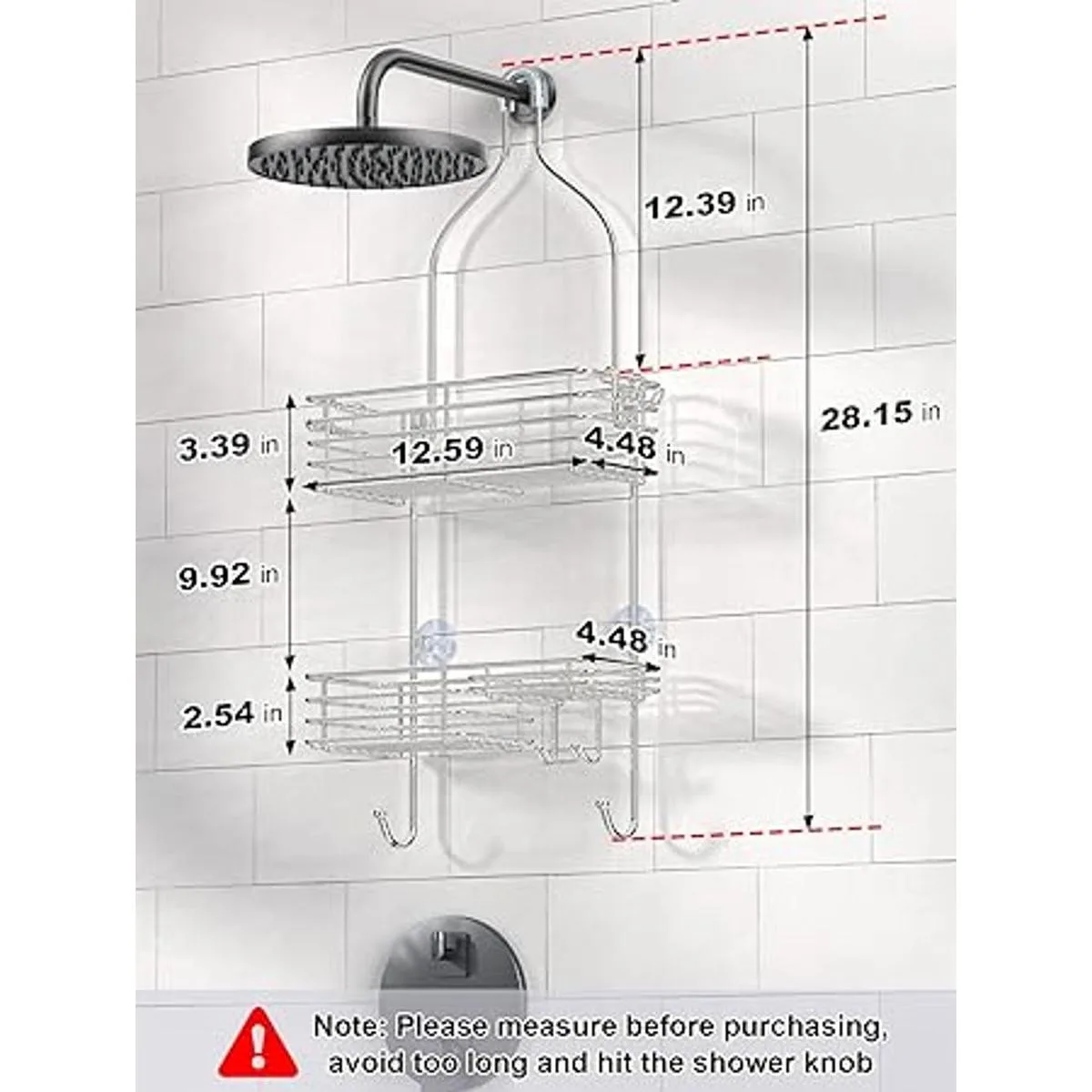 Tamaño clásico y aspecto exquisito: tamaño: 28.2 pulgadas de alto, 12.6 pulgadas de ancho, 4.7 pulgadas de grosor. Los ganchos de carga se pueden colgar en el cabezal de ducha redondo ordinario con 1,8 a 0.8 in de diámetro. La apariencia general es simple y limpia, y la combinación de marco multifuncional te hará tener una mejor experiencia de baño