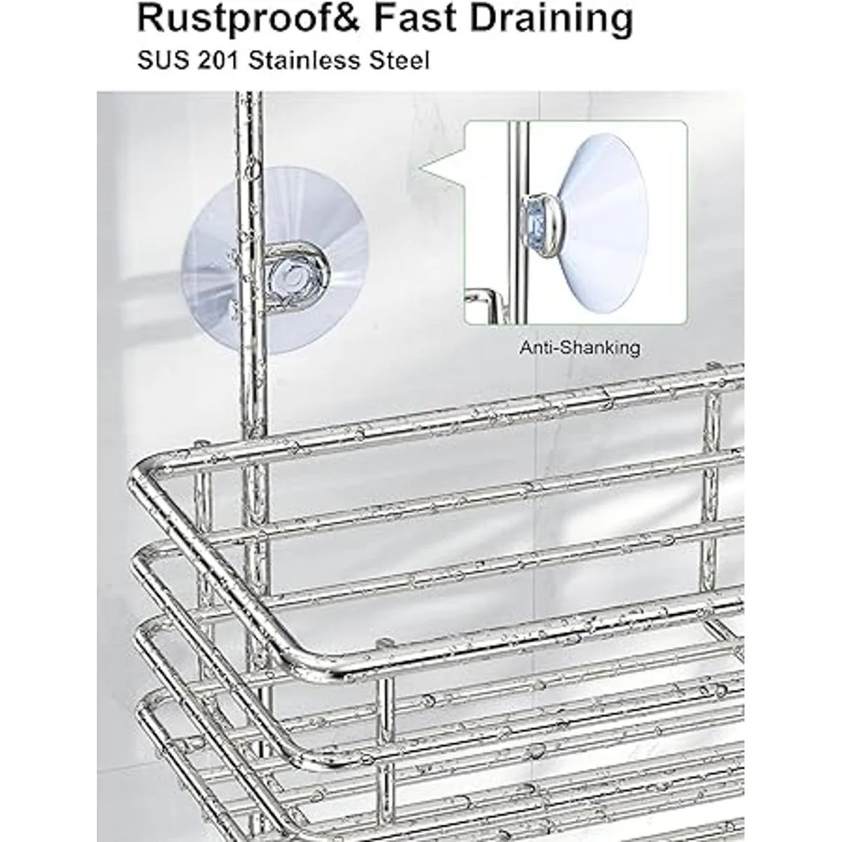Resistente, resistente al óxido y de drenaje rápido: está hecho de acero inoxidable SUS201, que no solo evita el óxido, sino que también tiene una buena dureza. Con el fin de mantener la estabilidad general, se añaden dos ventosas especialmente para estabilizar el marco. Drenaje rápido: la parte inferior hueca y abierta hace que el agua del contenido se seque rápidamente, fácil de mantener los artículos de baño limpios.