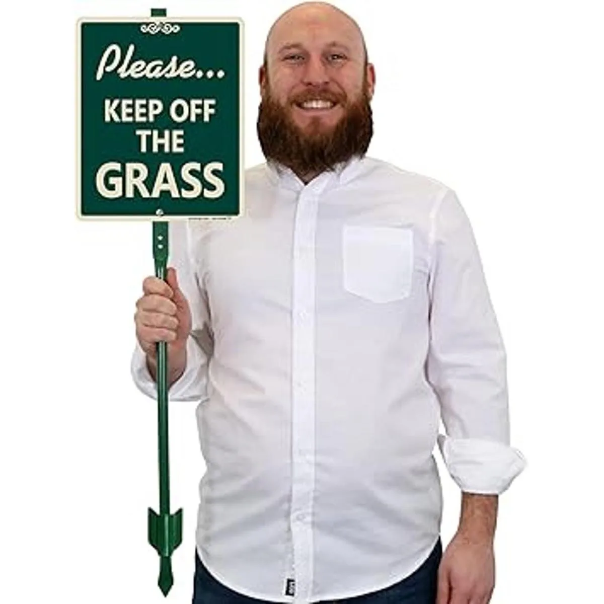 SmartSign Letrero de patio Please Keep Off The Grass de 12 x 10 pulgadas con estaca de 3 pies, aluminio laminado a prueba de herrumbre, verde y blanco, juego de 1